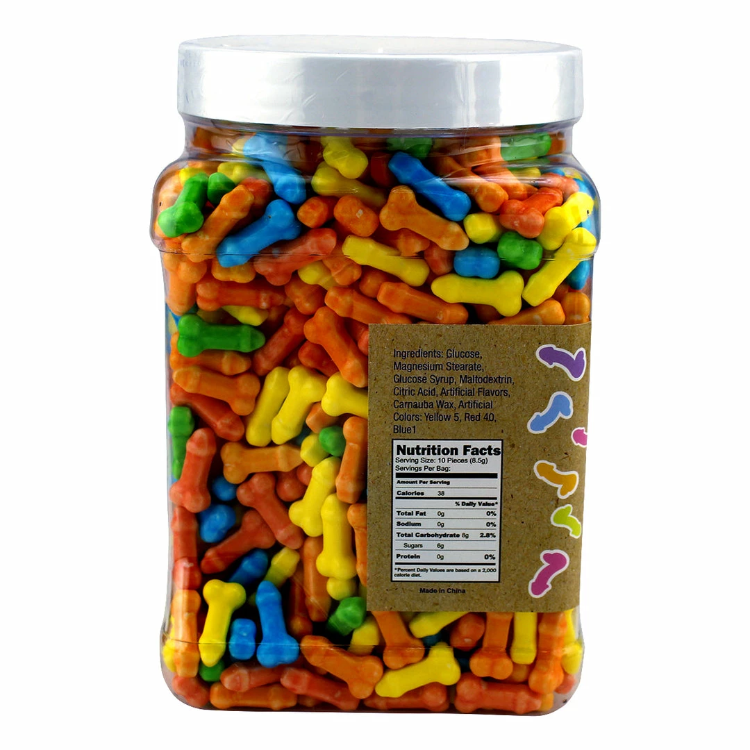 Each candy is small, about 3/4″ long, but there are lots and lots of them. This small size works great. They make a great snack to put out for your friends, they are also great for decorating cakes, cupcakes, and that sort of thing. These penis candies are really versatile. You’ll have no trouble using up the entire jar.