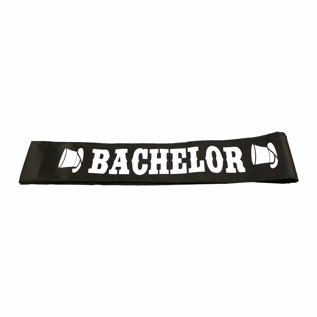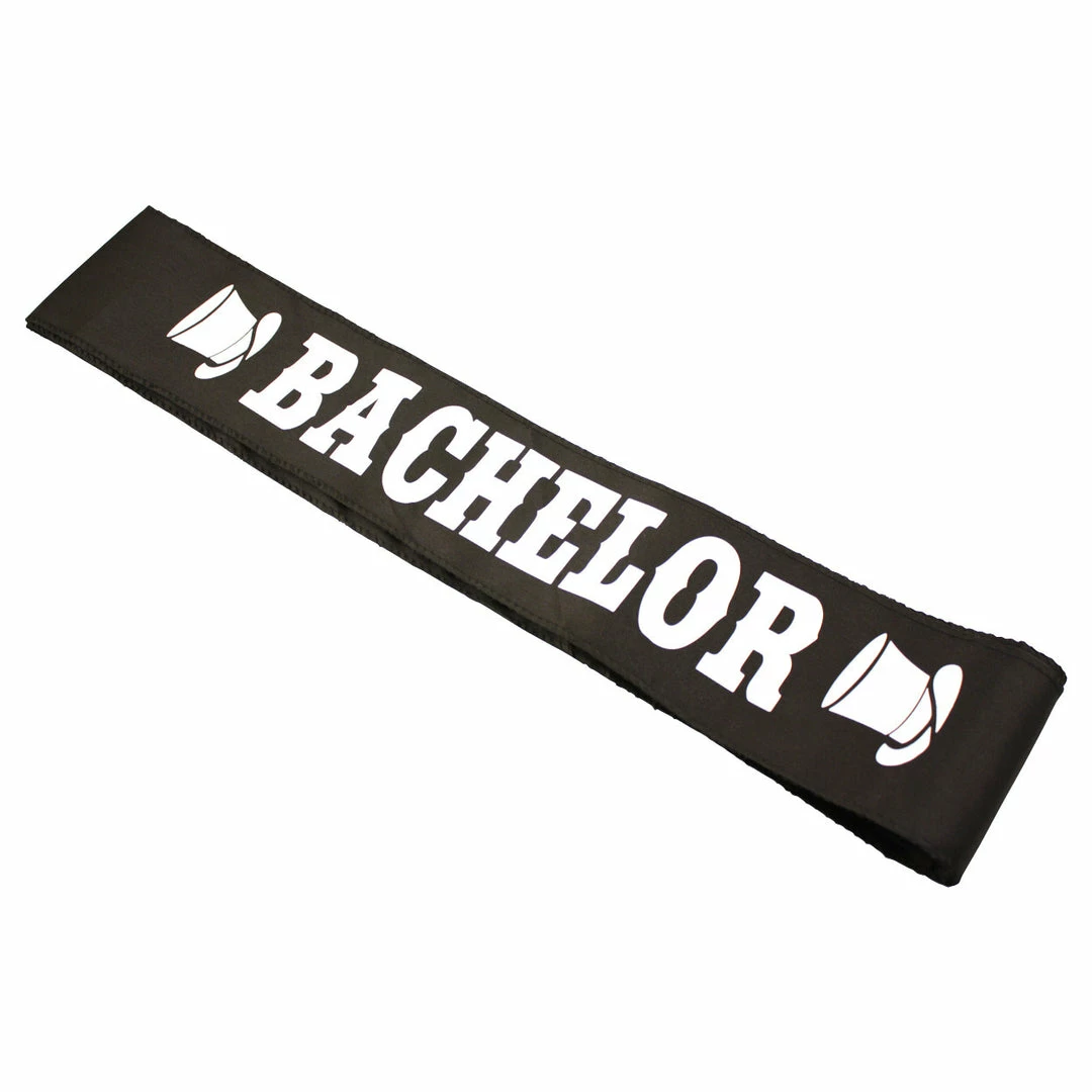 This black sash is perfect for gay weddings, for the prissy bachelor, or just about anyone who wants to wear a Bachelor Sash. This sash shows off the bachelor. It is black with white lettering and top hat detail. We like this sash because it tells everyone who the groom is, while still being manly enough for any daring bachelor. Have him wear it without a shirt for extra points.