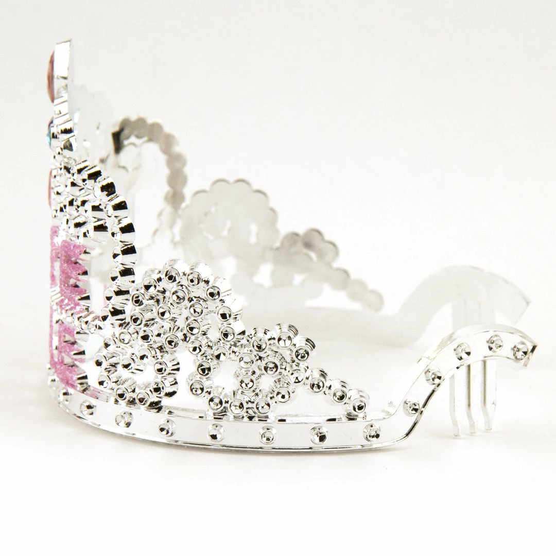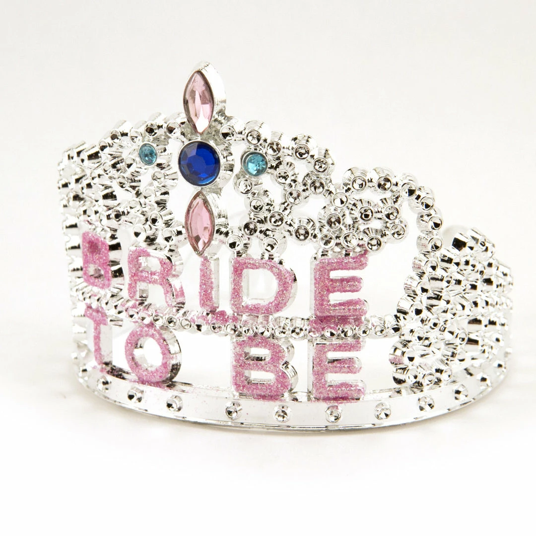 The Bride To Be Gem Tiara says, “Bride to Be” in pink, sparkly letters, and features pink, blue and teal gemstones. This is a good budget tiara for photo ops.