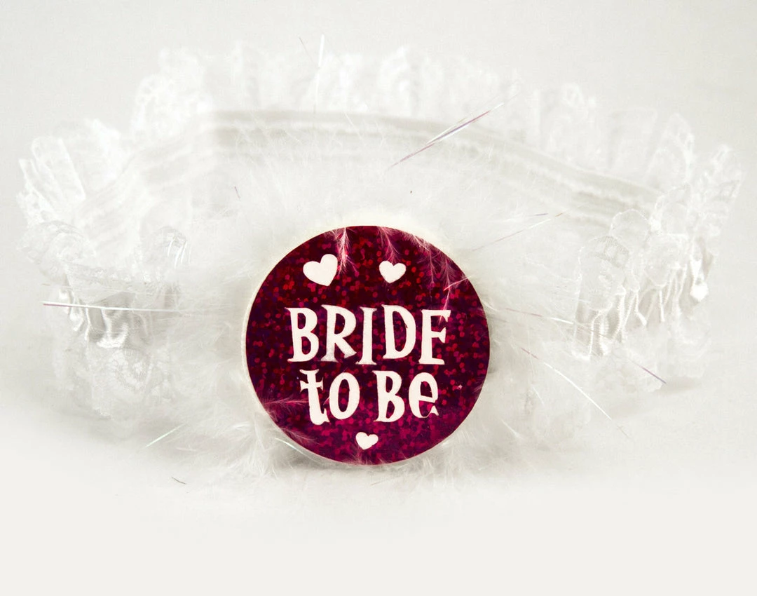 The Glitter Bride to Be Garter is a festive garter that looks sexy under a skirt or atop a pair of jeans. This white lace garter features a glittering button that reads, “Bride to Be.”