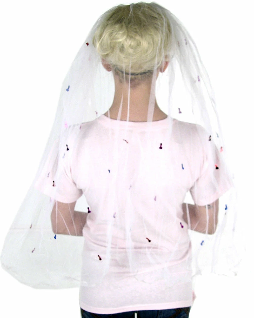 The Little Bit Naughty Veil is made of white tulle. It’s decorated with tiny, shiny, colorful penis cut-outs which are difficult to make out at a distance, but are very obvious when up close. This makes it perfect for drawing in guys, who are naturally attracted to shiny things they don’t understand. Then, when they see what it is you’re wearing, they’ll laugh and you’ll already have established the familiarity and connection you need to start setting them up with your bridesmaids.