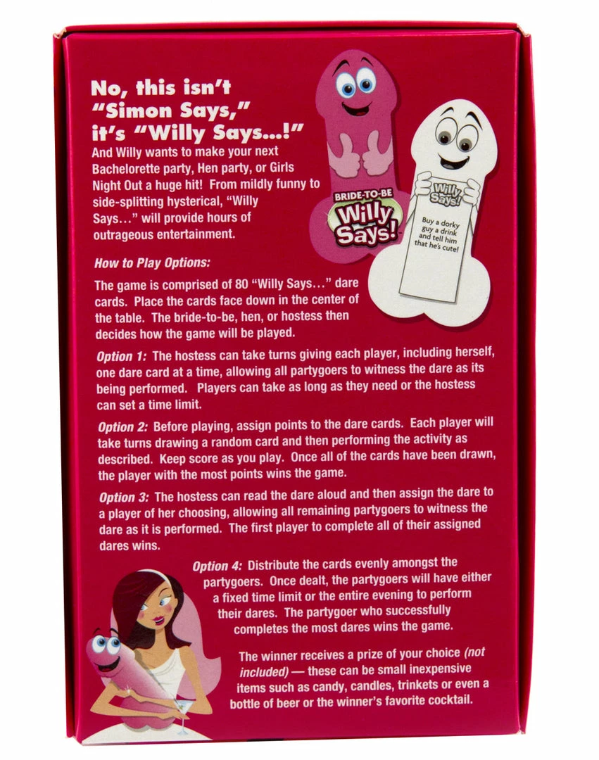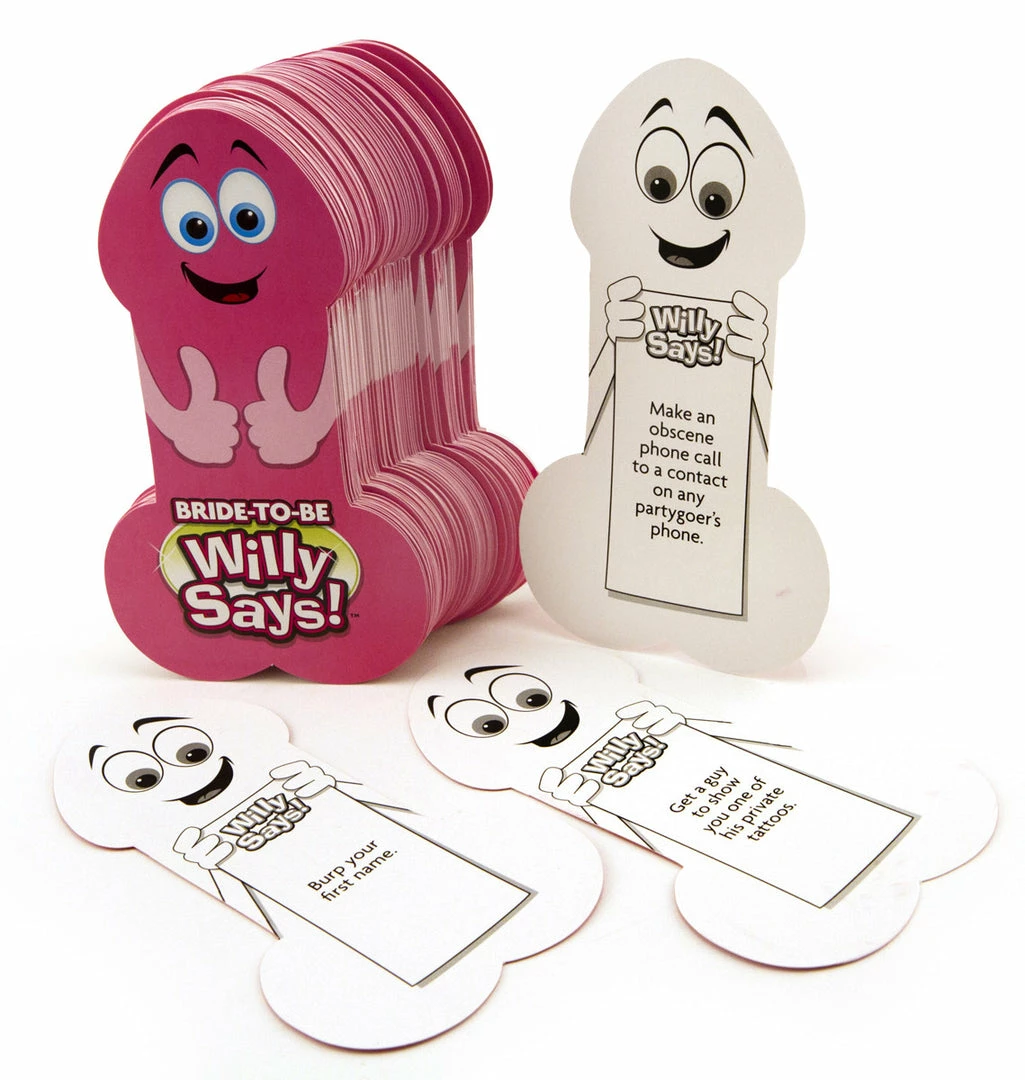 Willy is a fun, happy penis that will only tell you to do outrageous, silly things on the night of the bachelorette party. Way better than any of those other dicks, who demanded things of you on any other nights. Willy Says knows better, though. It’s just like Simon Says, but with Willy.