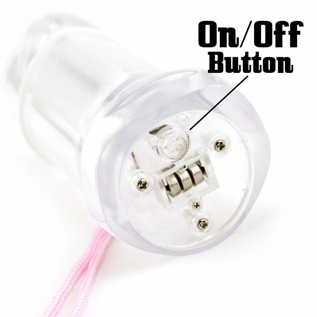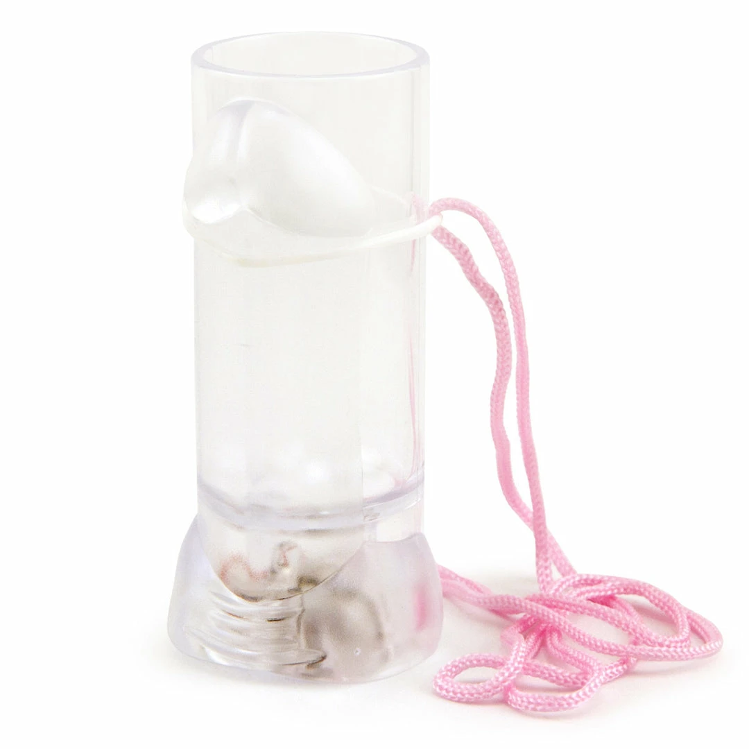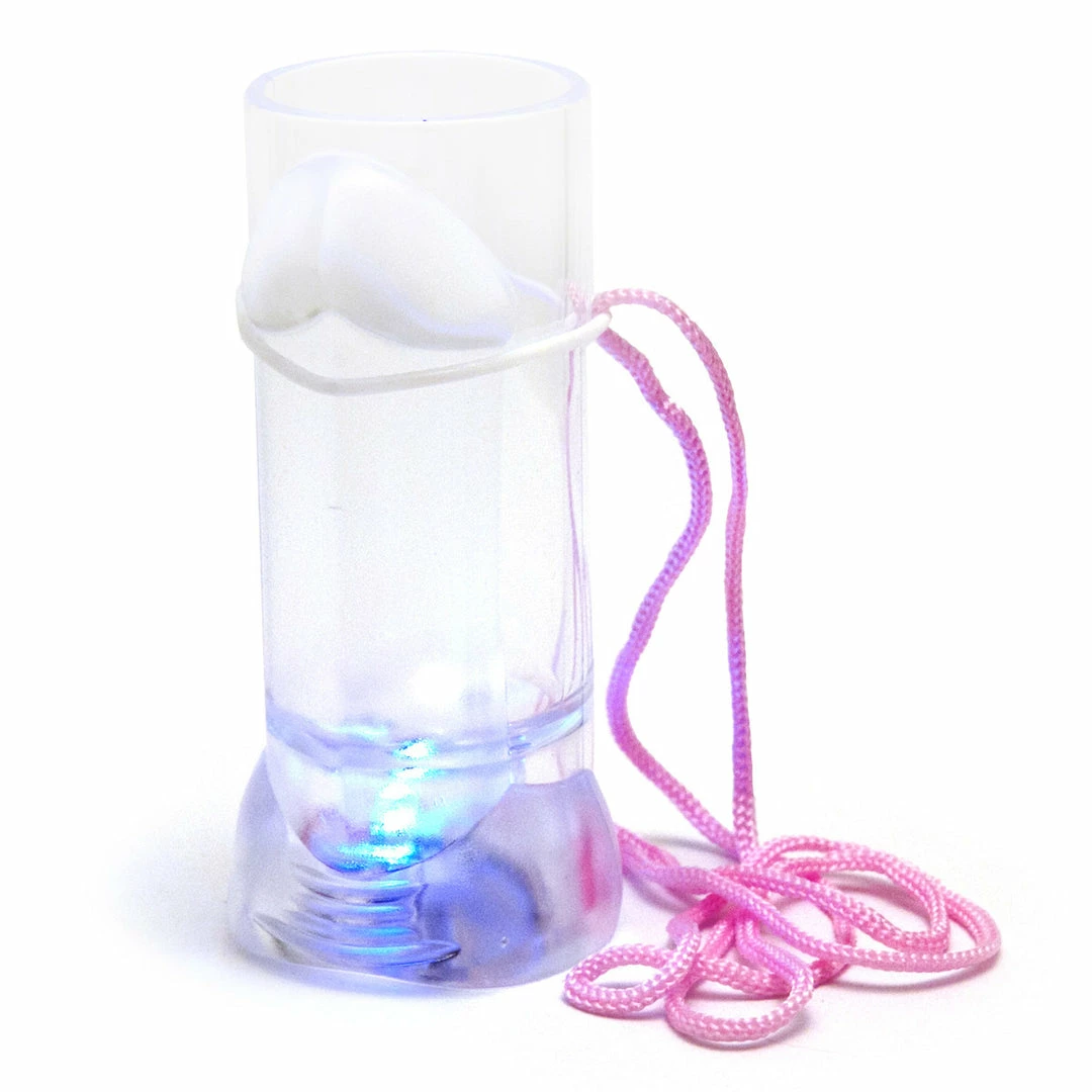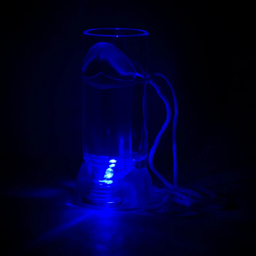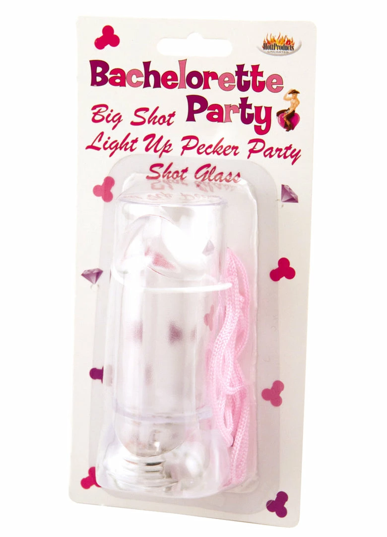 The Light-Up Penis Shot Glass is a clear plastic shot glass with penis detailing. It hangs from a sturdy pink cord. This shot glass is fun at an at-home party, but looks even better out at the bar.