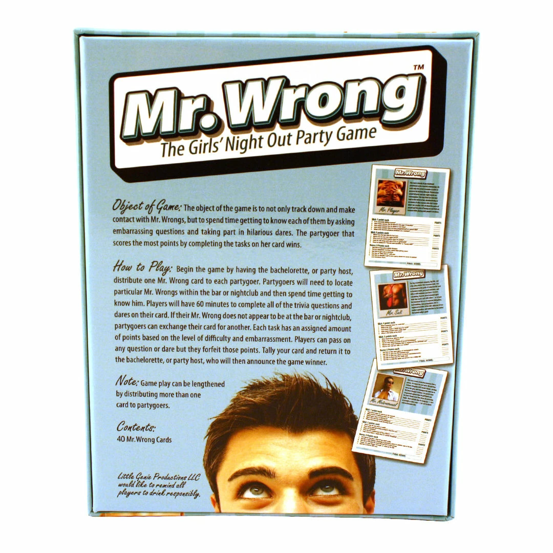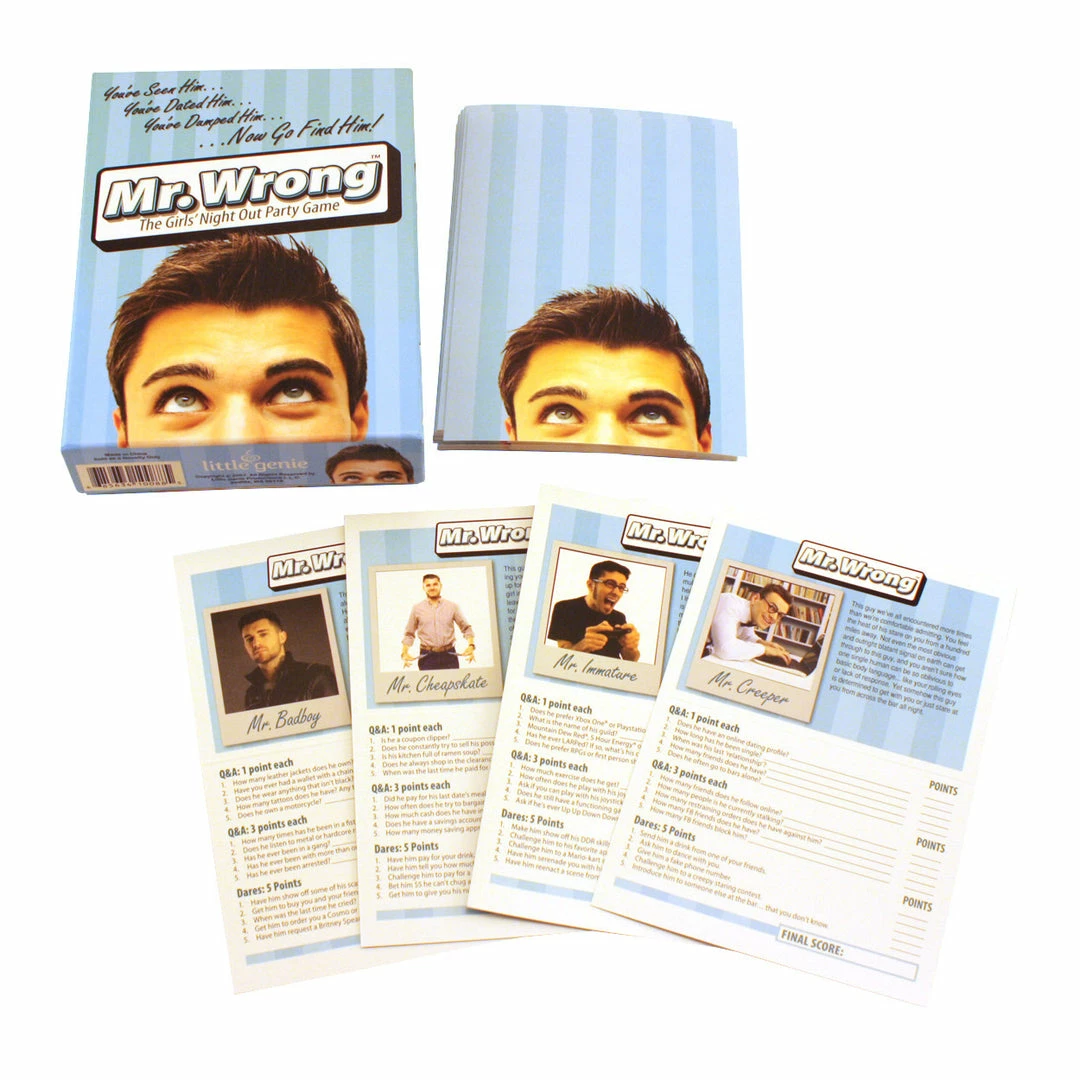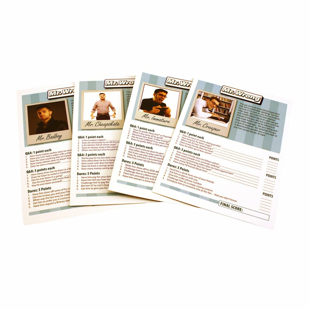 In the Mr. Wrong game, each girl will take one of the Mr. Wrong cards, which each depict a different male stereotype. Then you go out into the bar or club, try to find the guy on your card, and ask him questions or do dares to earn points. The tougher the challenge, the more points you get. You’ll only get one point for asking Mr. Badboy how many leather jackets he owns or Mr. Cheapskate if he cuts coupons, but challenge Mr. Couch Potato to a race around the bar or put your hands on Mr. Geek’s butt and you’ll net yourself a cool five points.