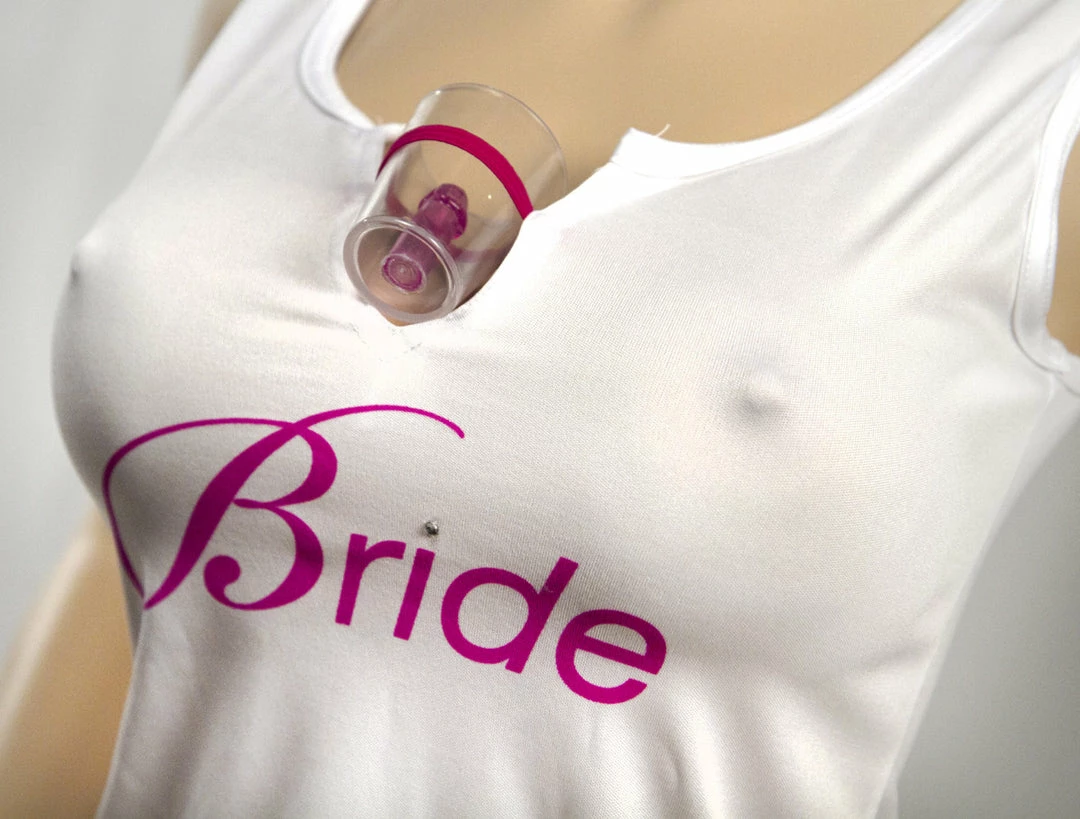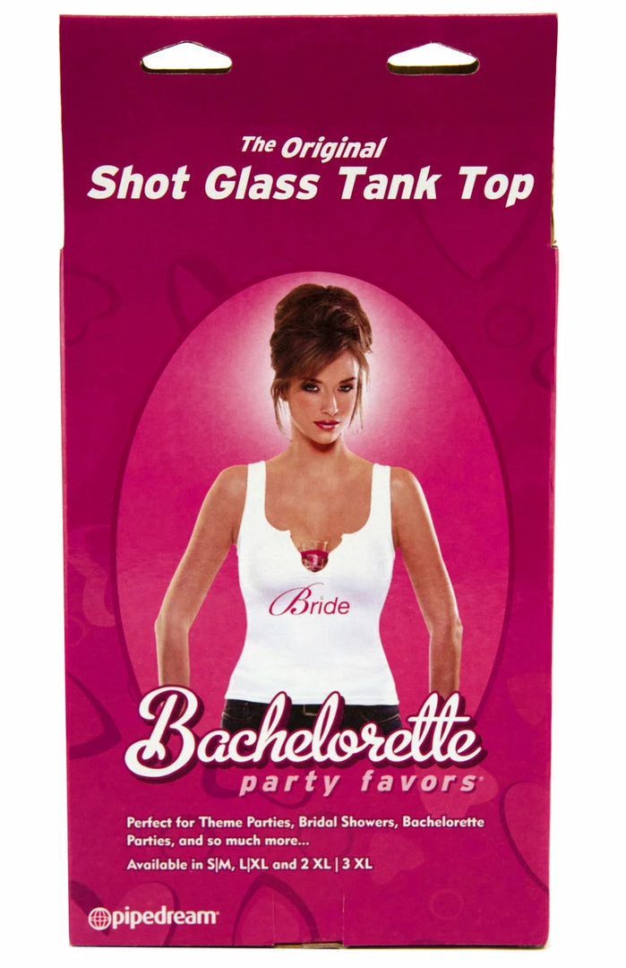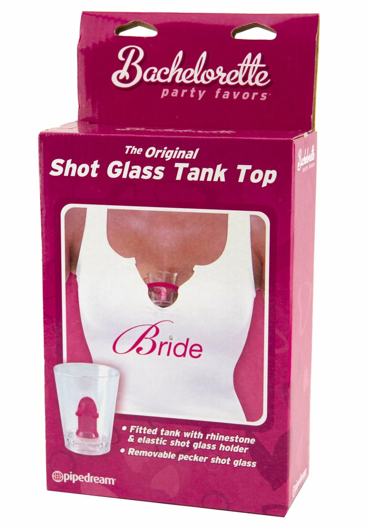 Want to dress the bachelorette for the wildest night possible? You need the Bride Shot Glass Tank Top! This white tank top says Bride in pink lettering across the front, and in its V-neck, it holds a removable penis shot glass. That way every dude that looks at the bride’s cleavage will be reminded to buy her a drink.