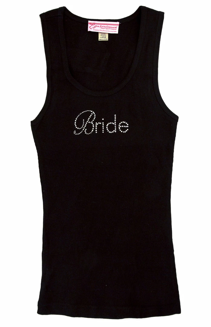 This 100 percent cotton, ribbed black tank top has the word “Bride” spelled on it with small white gems. No one will be able to forget who she is, not even the groom.