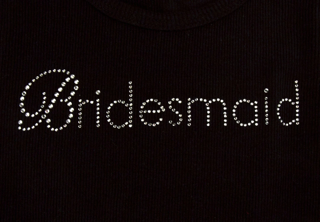 This 100 percent cotton, ribbed, black tank top has the word “Bridesmaid” spelled on it with small white gems.