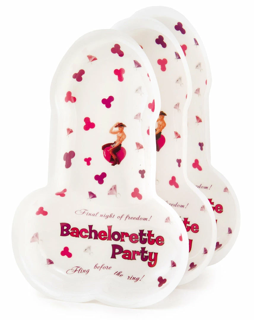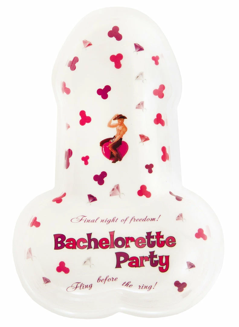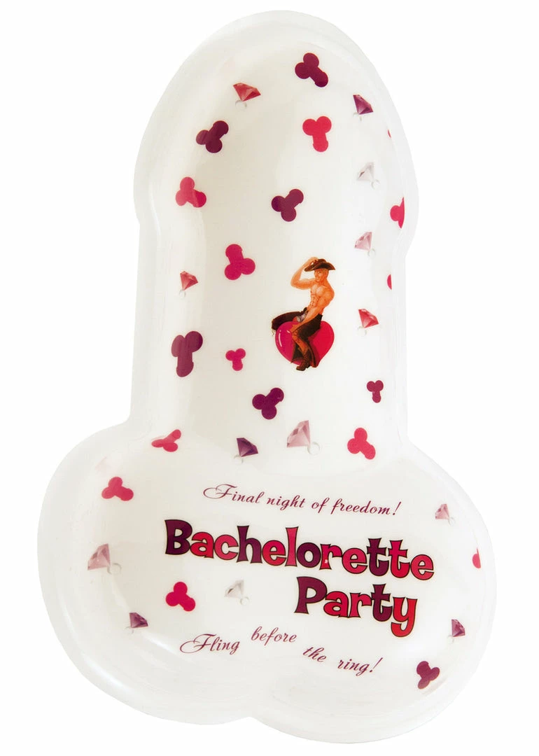 Who won? The little, adorable Bachelorette Party Candy Trays, of course. The Bachelorette Party Candy Trays are small candy dishes that will fit a few fun-size candy bars, or a slew of M&Ms, whatever you choose to serve at your party. They’re covered with little pink and purple hearts and penises, along with the words, “Final Night of Freedom Fling Before the Ring!” and “Bachelorette Party.”