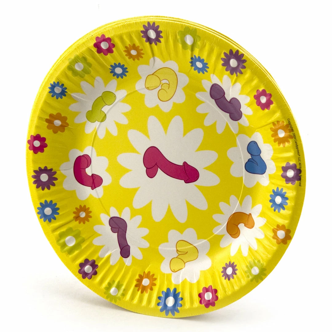 The schlongs on these disposable plate are cleverly disguised as hippie flowers. Spread the love of the sixties, while harboring secret penii. Raise an eyebrow or two when people finally notice that some of the flowers have pollen of a different sort.