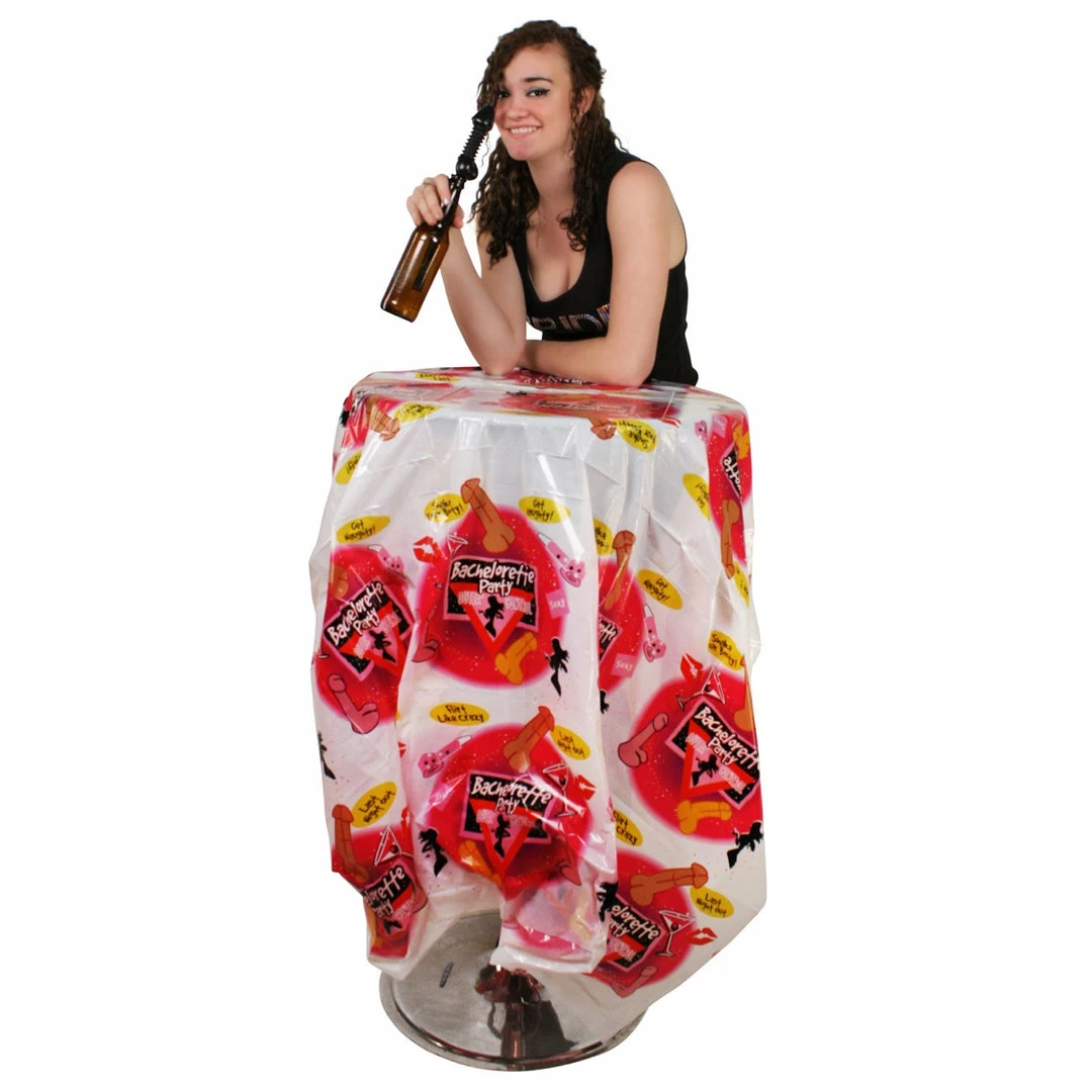 This fun bachelorette party table cloth measures 52″ x 72″.