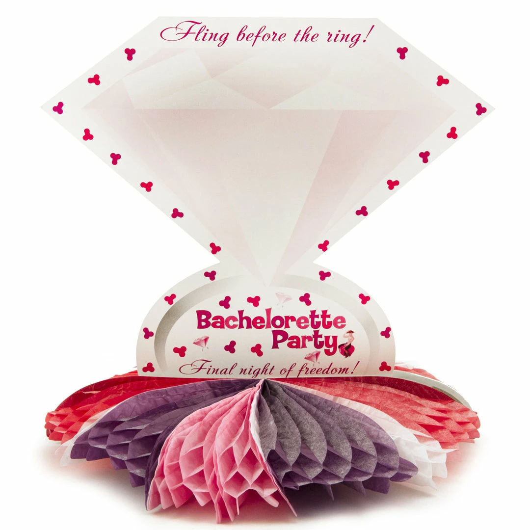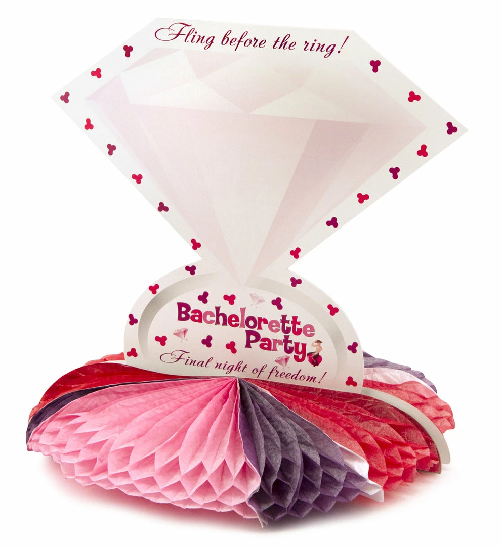 Add some pizazz to your dinner or snack table with the Diamond Ring Centerpiece! The Diamond Ring Centerpiece matches our Diamond Ring place settings, banner and more. This centerpiece features a large engagement ring, with the words “Final Fling Before the Ring … Final Night of Freedom!” across the front, along with the words “Bachelorette Party.” Decorated with little pink and purple penises and tiny engagement rings, it’s perfect for your bachelorette party.