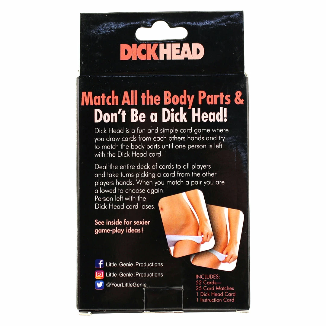 Dick Head is a fun and simple card game where you draw cards from each other hands and try to match the body parts until one person is left with the Dick Head card! It’s based on the popular card game Old Maid.