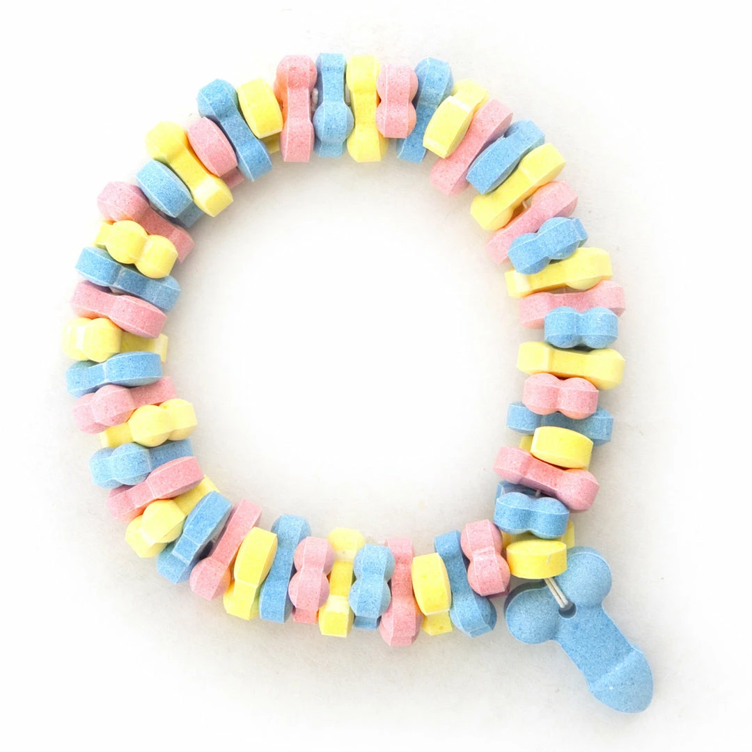 Strung onto the one-size-fits-all elastic band of this necklace is an assortment of multicolored wee-wees. They taste great and have quite a distinctive shape that’s sure to catch the attention of anyone who gets close enough to see what they are!
