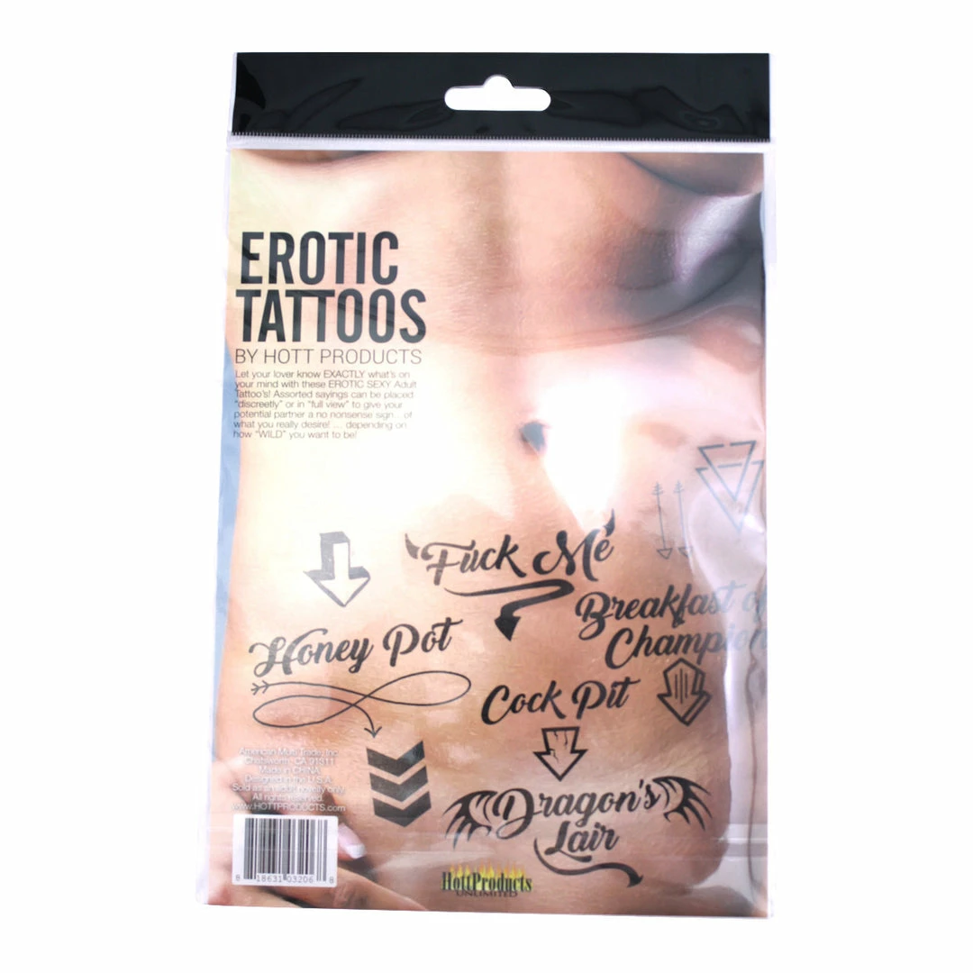 Fortunately, Bachelorette.com has you covered with a counter-plan you can have at the ready: trashy temporary tattoos. Really trashy temporary tattoos. Tattoos that you apply above your ladybits with arrows pointing downward that say things like “Cock Pit” and “Fuck Me.” The sort of tattoos that would instantly fill a freshly-sober person with regret and have them swearing an oath never to drink again – if they were permanent, that is.