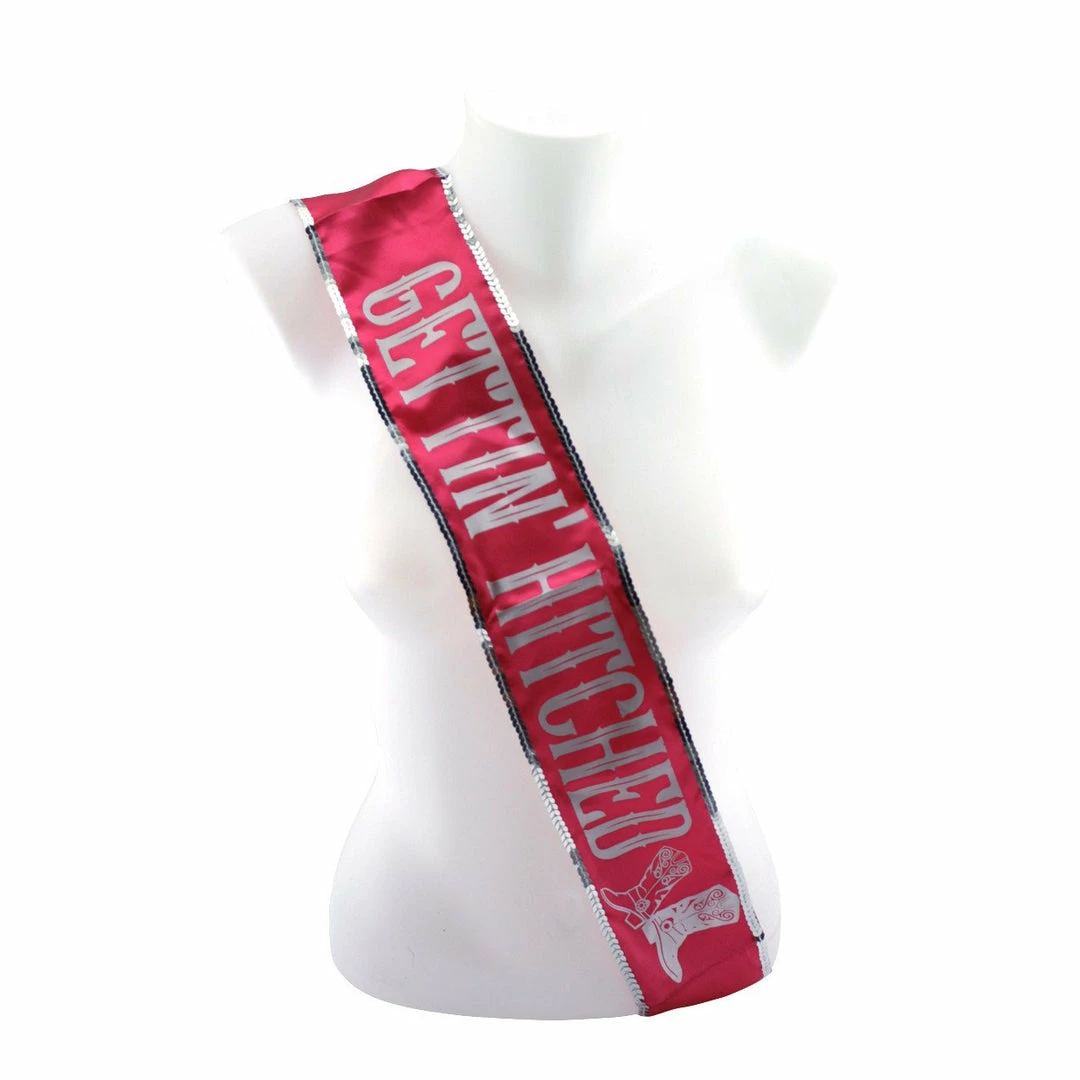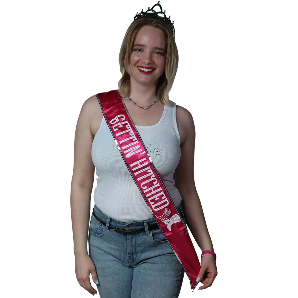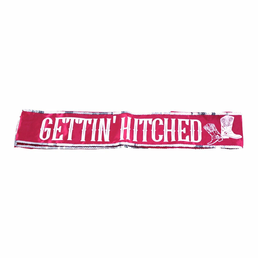 Can’t decide between playing up your girlfriend’s country-western side or making her feel like a princess for her big night out? Do both with the Glow in the Dark Gettin’ Hitched Sash! This beautiful satiny sash is bright pink with an outline of silver sequins which are sure to make her feel elegant and royal. But don’t worry, it won’t make anyone think she’s just a pampered princess – it also says “Gettin’ Hitched” and features a pair of cute cowgirl boots, so everyone will know she’s a country girl who can get rough and rowdy, too! And best of all, it glows in the dark, so no matter how late your royal ball or rodeo goes, she’ll keep shining all night long!