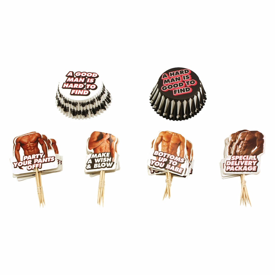 In this set you also get 24 cupcake toppers, which are cute cardboard cutouts on toothpicks. This set four different hot bods, with slogans like, “Bottoms Up to You Babe.” You’ll get six of each type of topper, for a total of 24.
