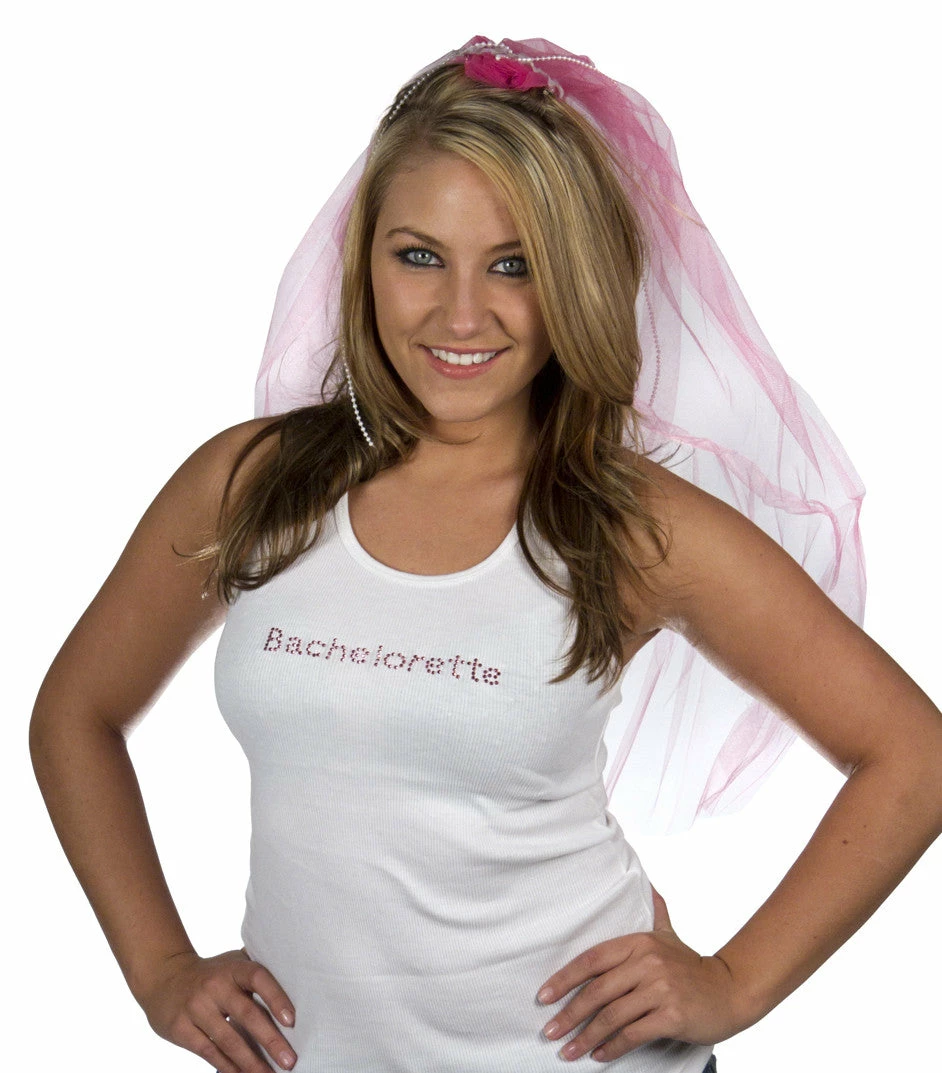 This sweet and innocent White Bachelorette Pink Gem Tank Top is perfect for the prissy bachelorette. This 100 percent cotton, ribbed white tank top has the word “Bachelorette” spelled on it with small pink gems.