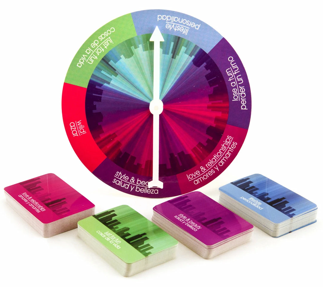 The Ladies Night Game has four types of cards with questions: Love & Relationship Cards, Lifestyle Cards, Just for Fun Cards and Style & Beauty Cards. Take turns spinning and asking the bachelorette and friends questions like:
