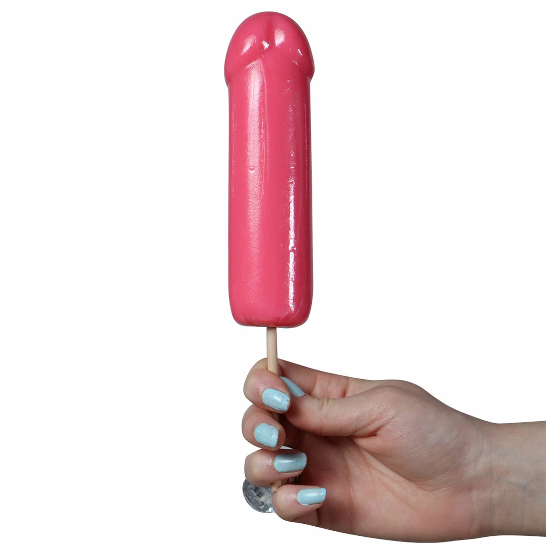 This sucker is big. The surface of it is kind of veiny and realistic. The stick is wooden. As you can see from the picture, the Lollicock is positively giant when compared to the other penis pops that we sell at Bachelorette.com.