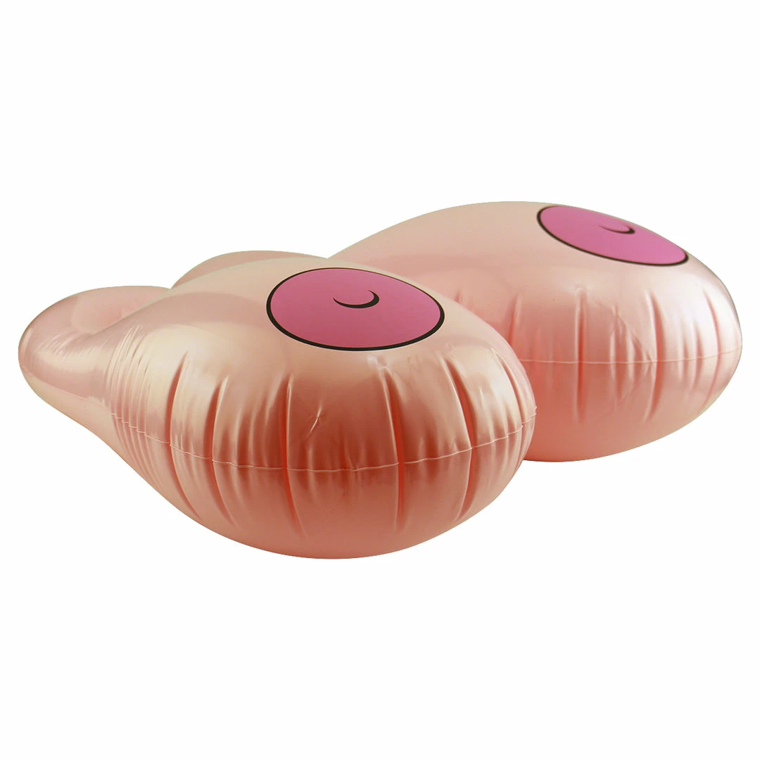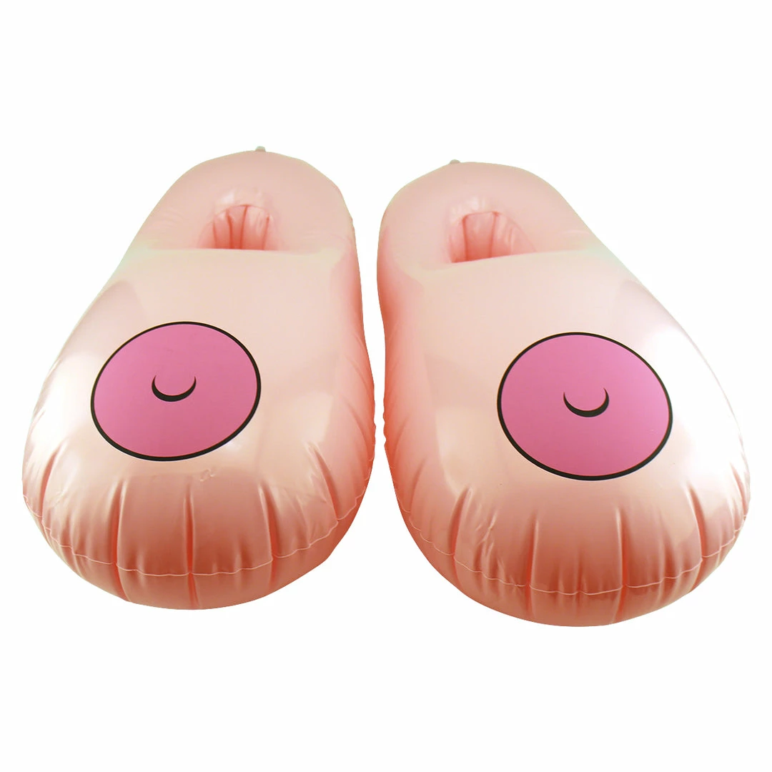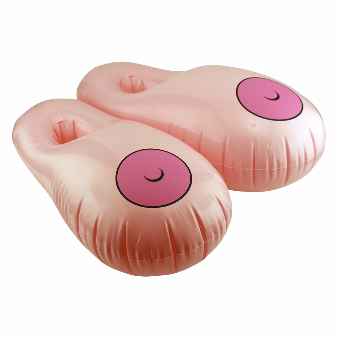 New, from the people who brought you boobie inflatables and boobie slippers, it’s… inflatable boobie slippers? What, did somebody think that just mashing two successful ideas together would make an even more successful idea? Well, who am I to argue with that logic? Let’s try doing the same thing: we’ll mash the item descriptions for the boobie inflatable and the boobie slippers together to come up with a description for these: