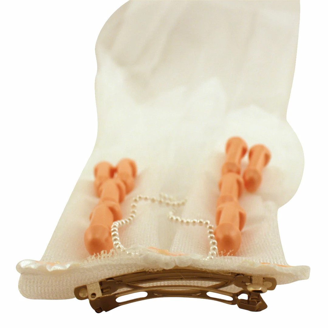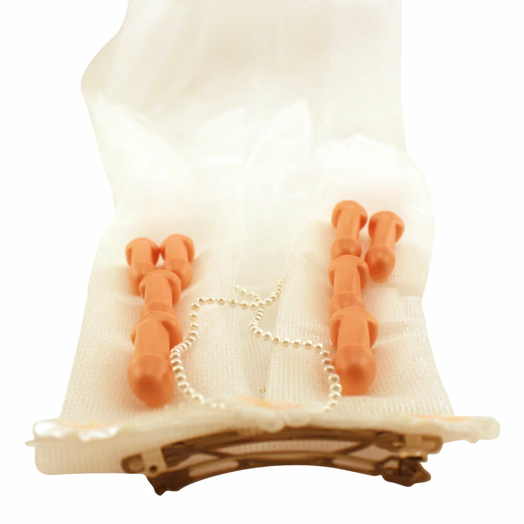 Step Two: Keep it folded up, and only show her the side that the little plastic penises aren’t attached to. She’ll think it looks perfect. Taking care not to reveal the penile surprise on the other side, clip it to the back of her head – the attached hairclip will clip to short or long hair.