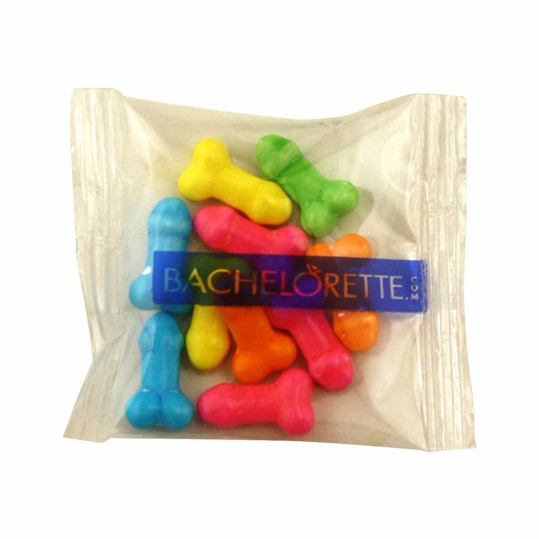 Despite their small stature, these guys are delicious, with a flavor so big they taste three times their size. They’re fruit-flavored and come in five different colors, to please the girls at your party who like penises of all shades and colors. Each package contains a random assortment of ten fruit-flavored penis candies.