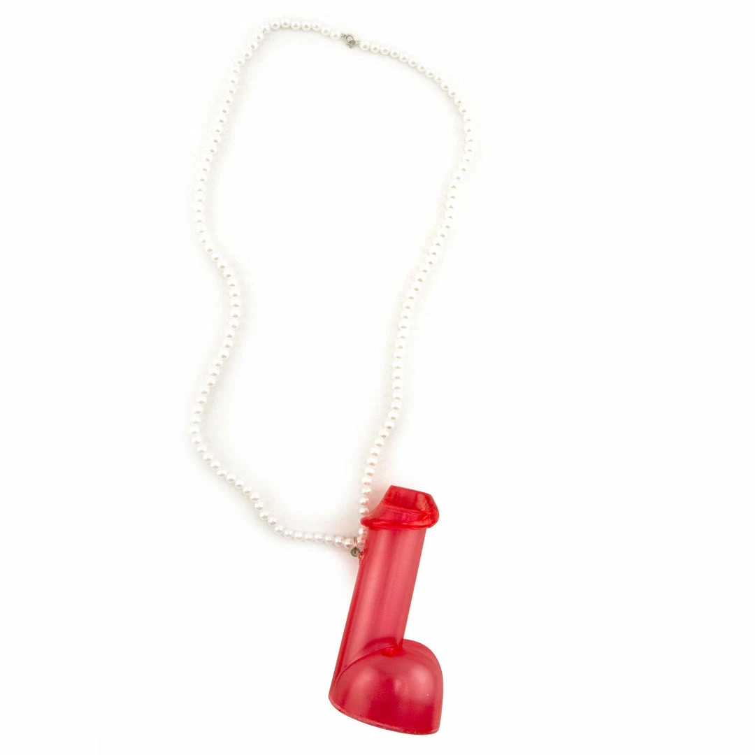 The pink plastic penis on this necklace is 4.5″ long and the shaft is 1.2″ thick. Pretty sizeable! But that’s not all you get. It comes attached to an elegant pearl necklace that everyone will envy. And the balls at the base of the shot reach out to 2.25″ wide, too. That’s a pretty big shot. Gulp!