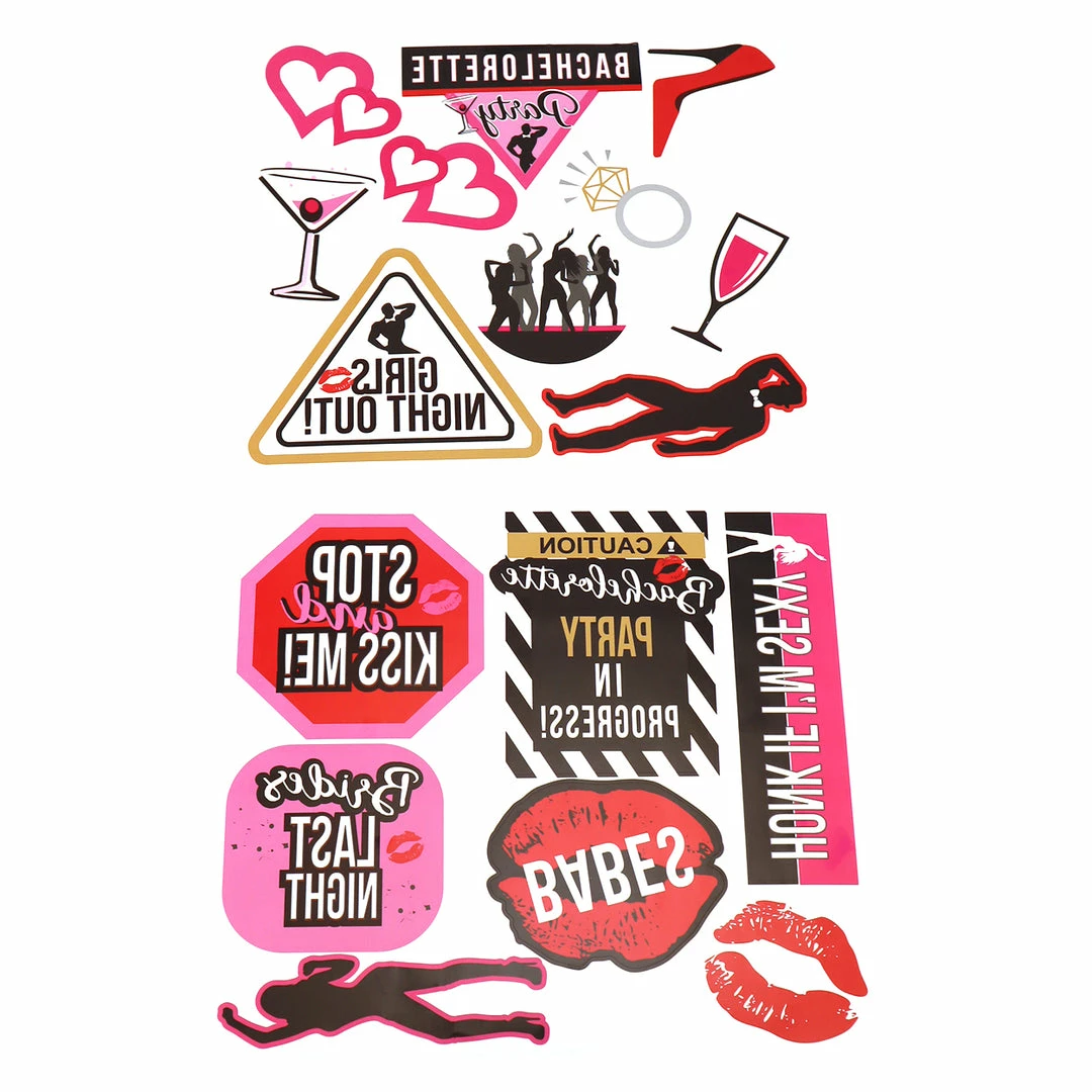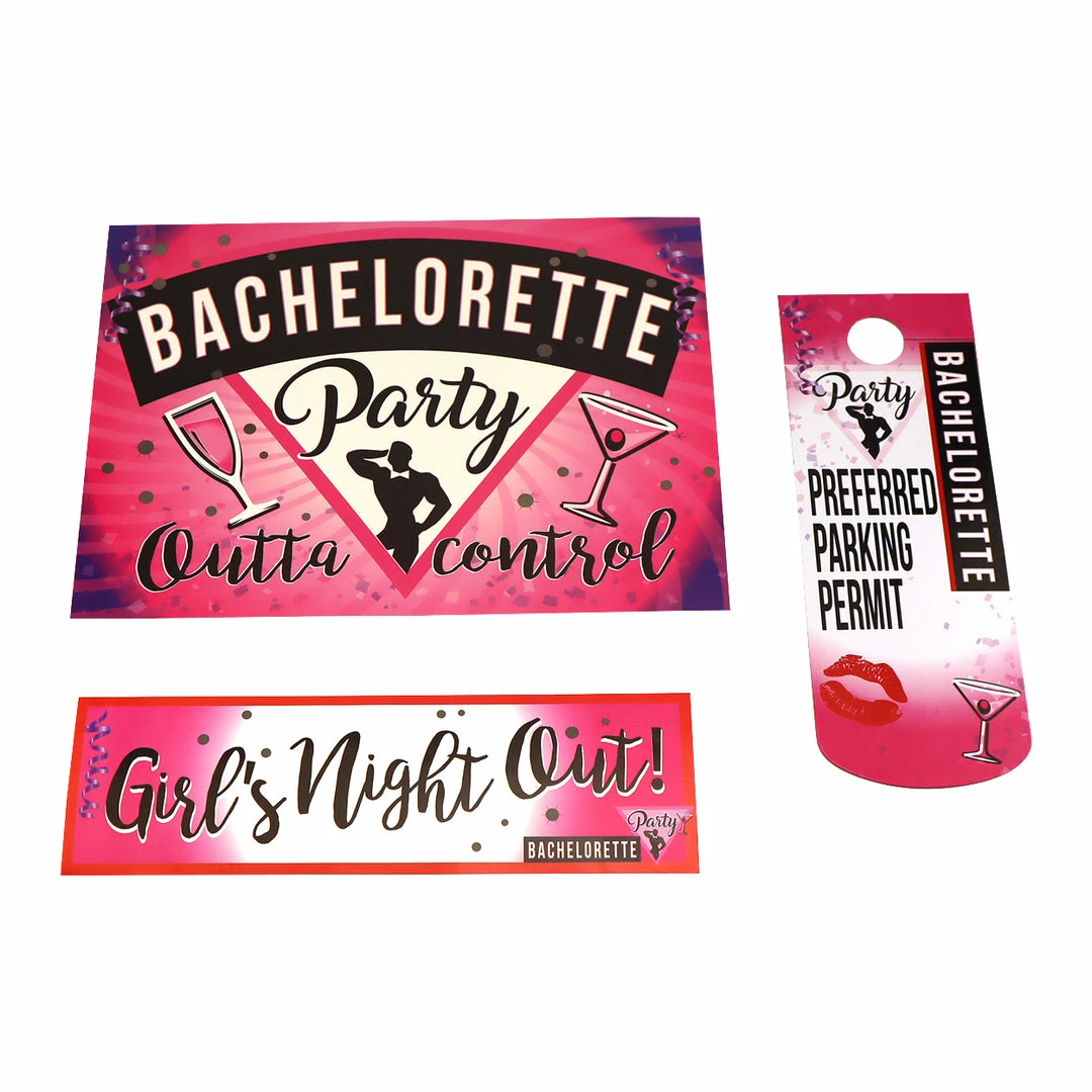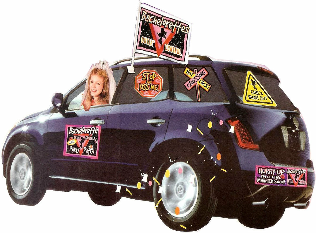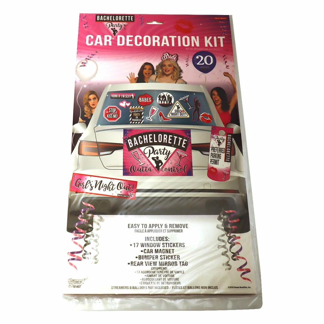 The bumper sticker and door magnet advertise an outta control bachelorette party in progress. The mirror tag says “Preferred Party Parking Permit.” The 17 vinyl window decorations include kisses, martini glasses, caution signs and more.