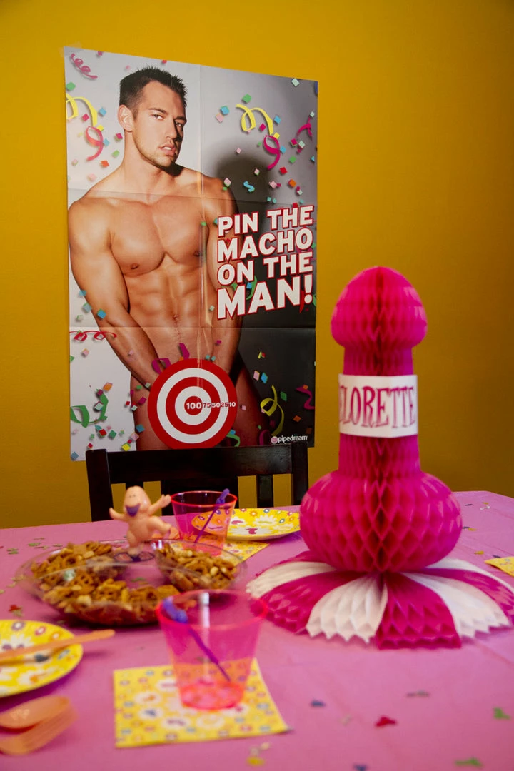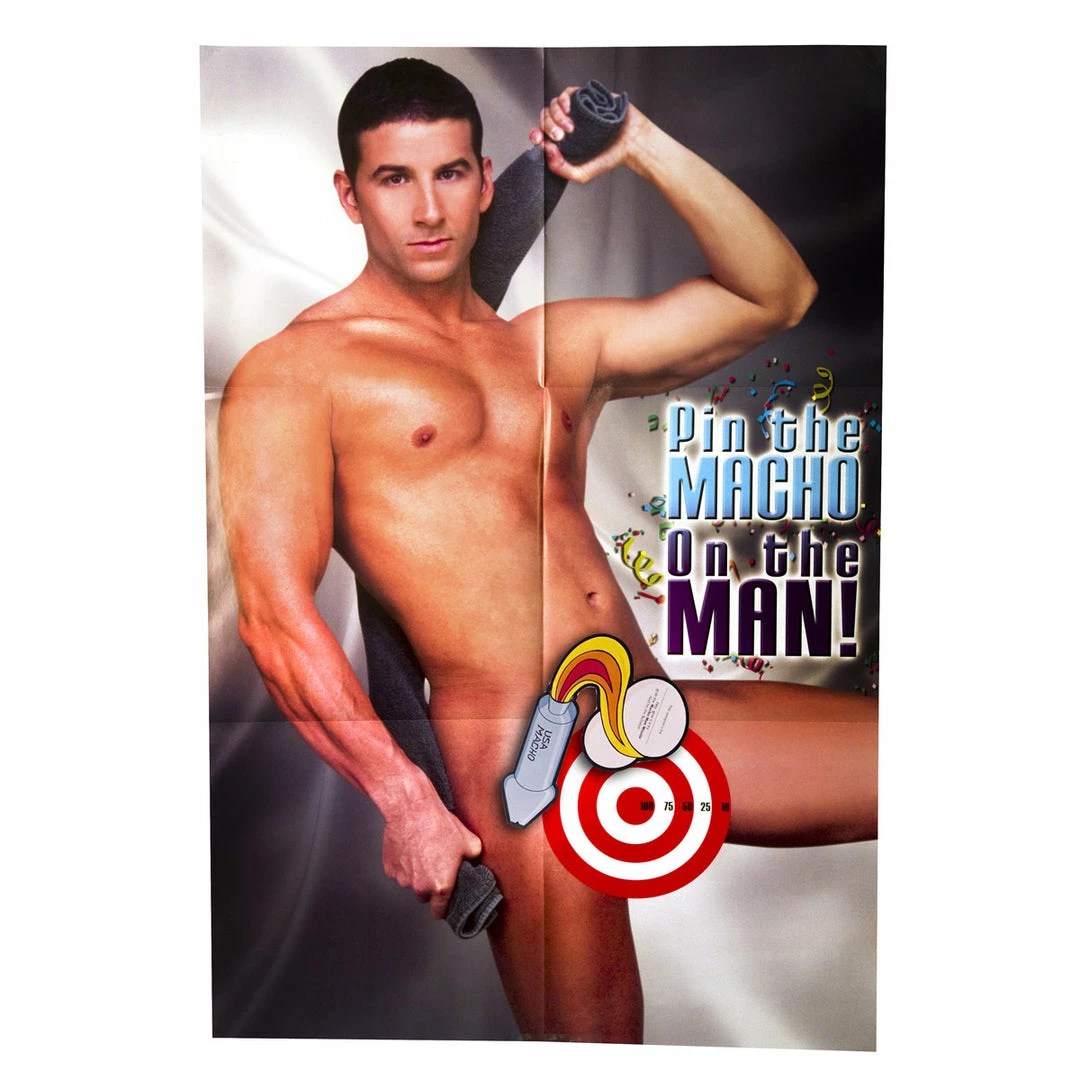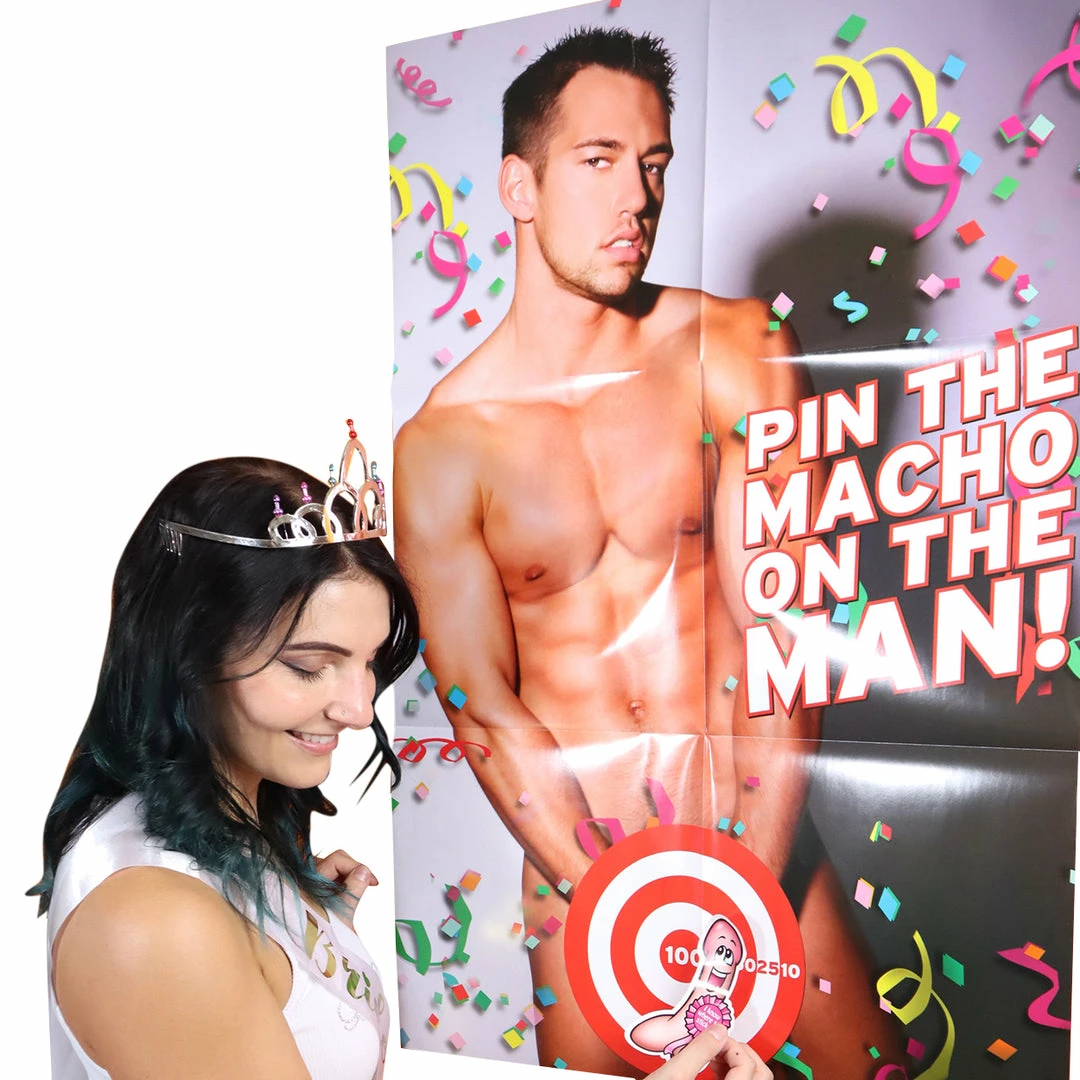 You will have to supply your own tape and blindfold. Otherwise, Pin the Macho on the Man has everything you need in a bachelorette party games.