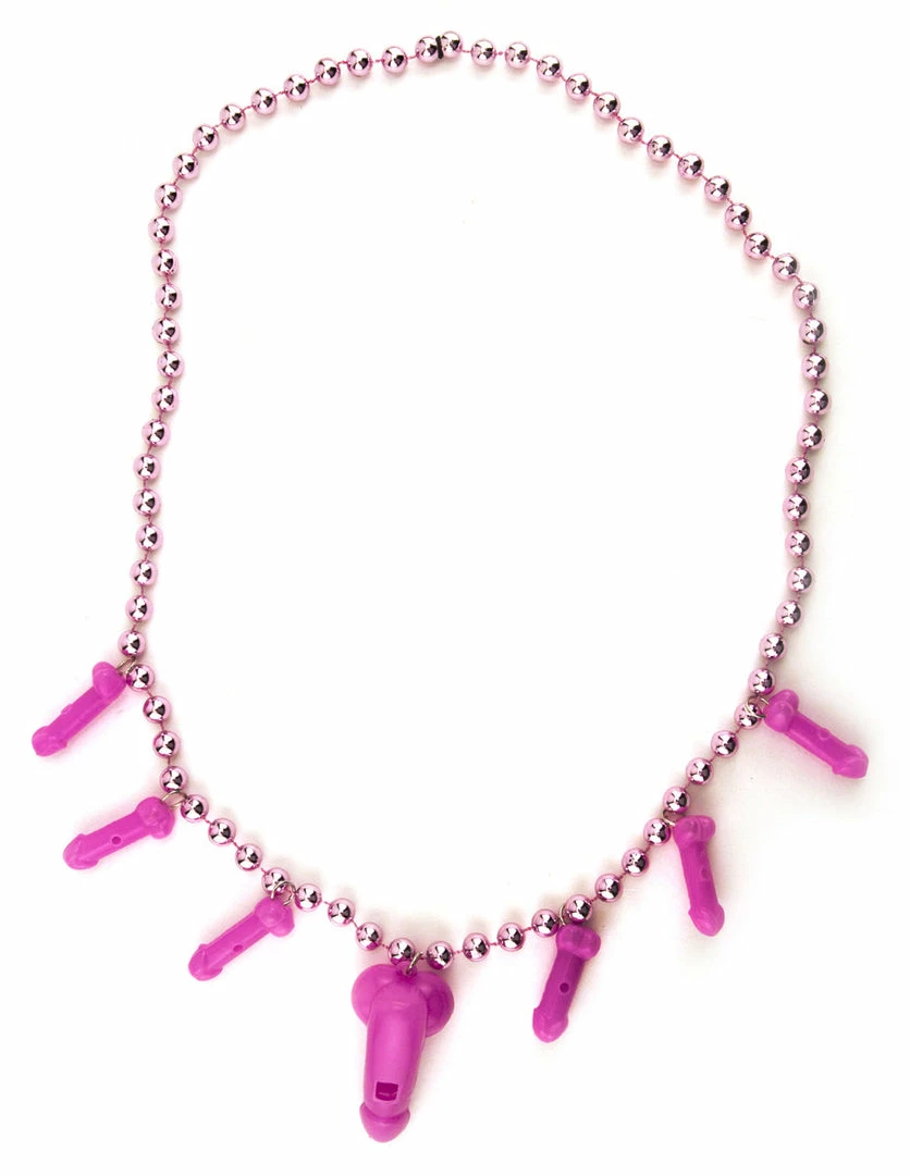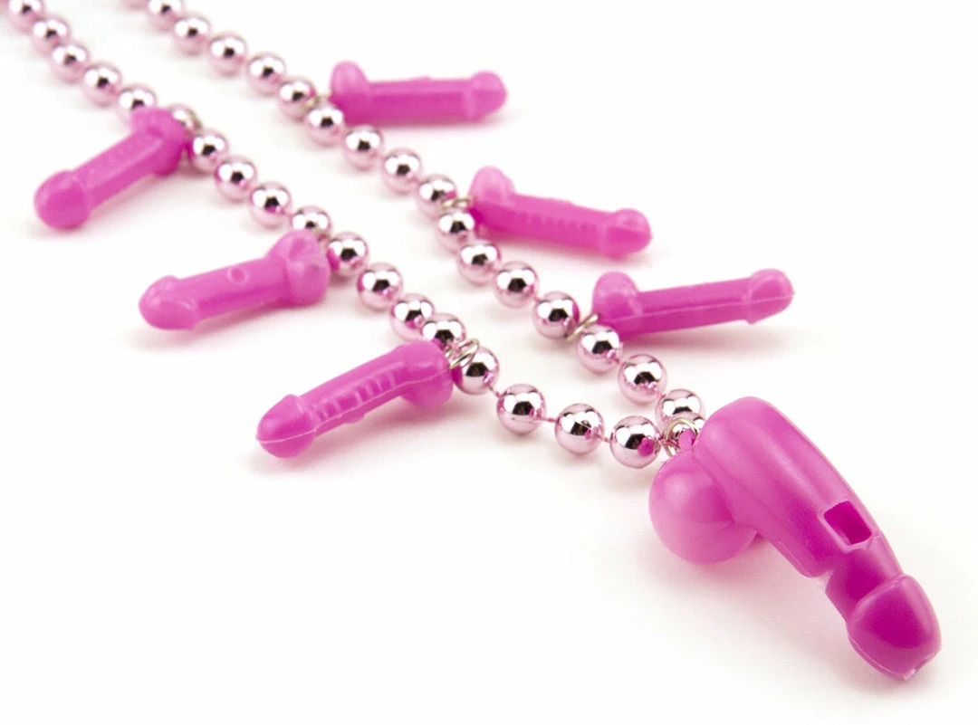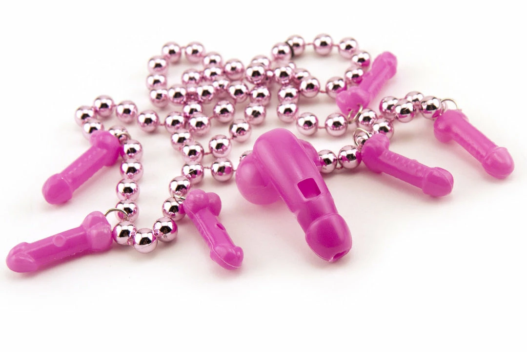 The Pink Penis Whistle Beads are adorned with tiny plastic penises. The biggest penis on the necklace is the best (of course) because he’s also a whistle. Put this penis up to your lips and blow to get him to make some noise!