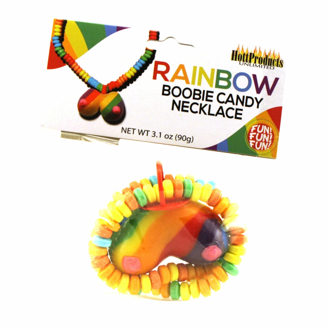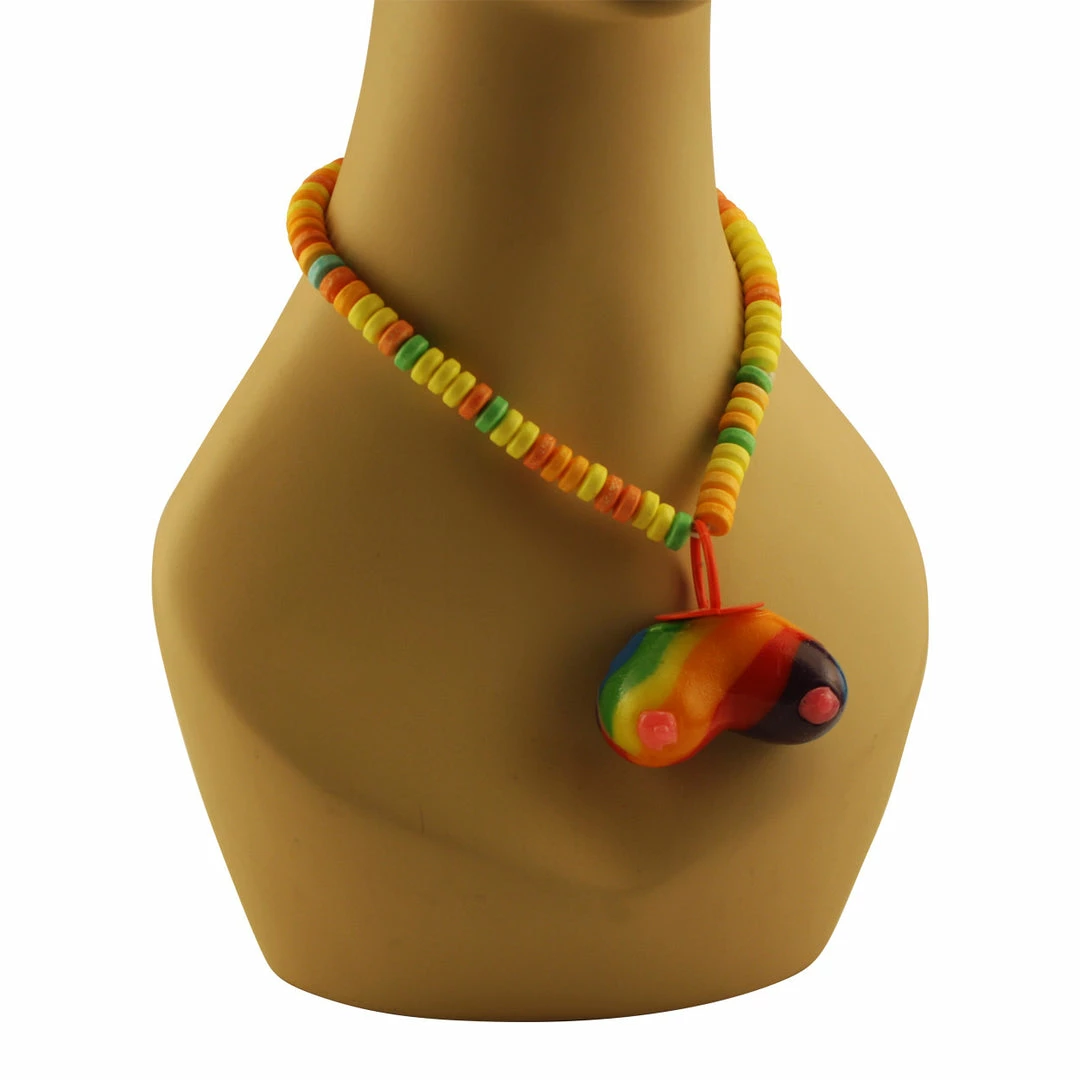 The Rainbow Candy Boobie Necklace is a necklace made from little colorful hard candies, with a very special charm on it – a gigantic 2 ounce chunk of boob-shaped rainbow candy! These tatas taste as great as they look, and they look pretty spectacular. The bachelor might think he doesn’t want his own pair of boobs, but trust us, after a couple of minutes with this necklace, he’ll be off to the lingerie store for a candy bra to go with them.