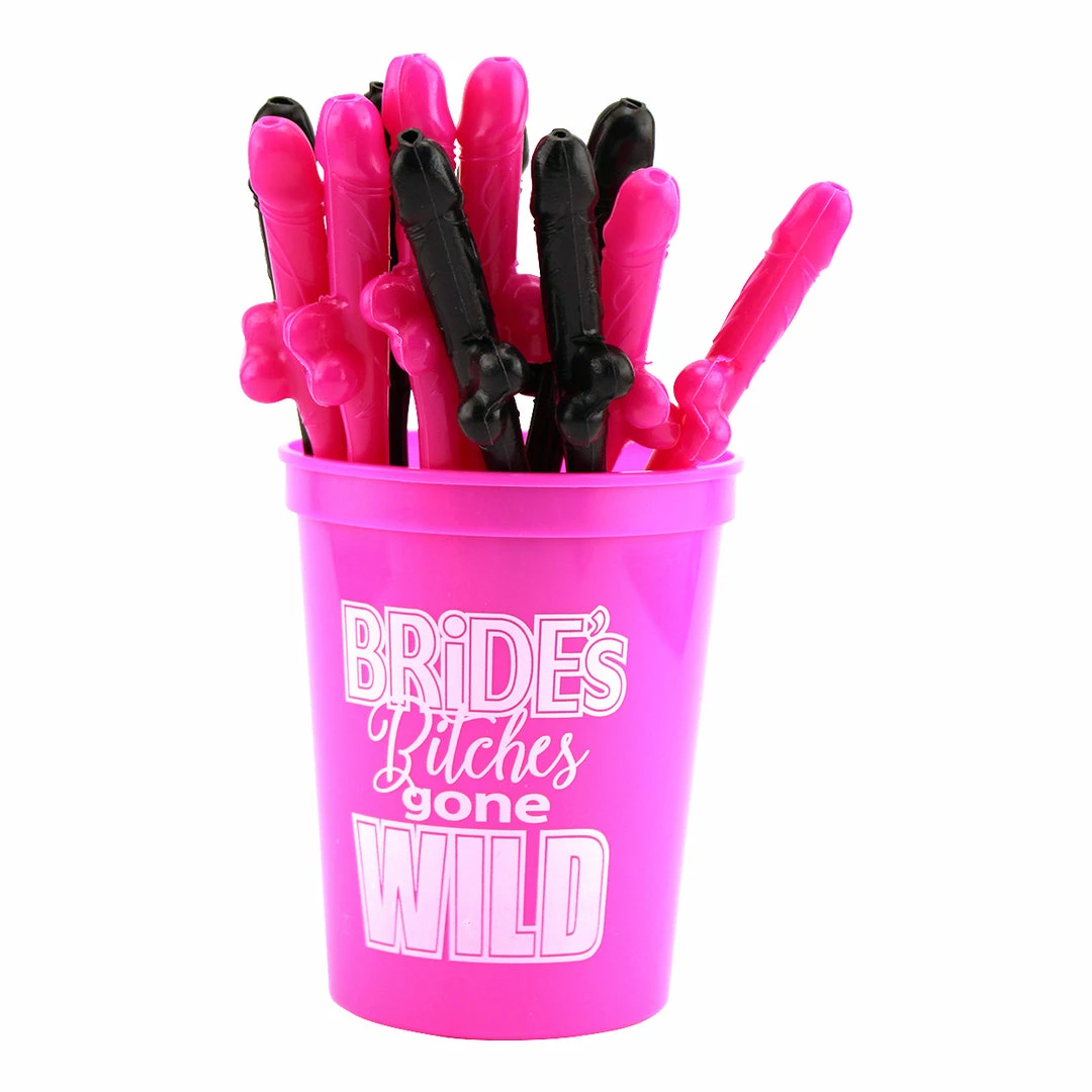 After nearly 20 years of selling all kinds of penis straws – realistic penis straws, rainbow penis straws, glow-in-the-dark penis straws, you name it – Bachelorette.com is now proud to foray into the final frontier of penis straw varieties: penis straws of our very own! These cute straws are hyper-realistically detailed (complete with veins, head and balls), long enough to fit in any container you choose to drink out of (7.5 inches), and come in a mixture of jet black and hot pink (6 of each).