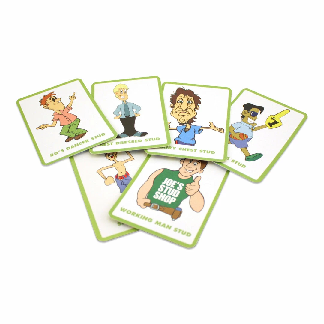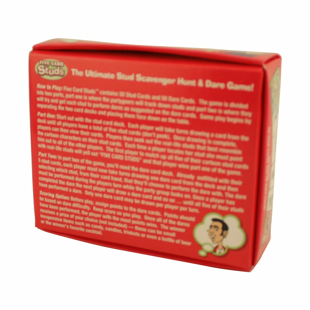Five Card Studs comes with 50 Stud Cards and 50 Dare Cards. In Part 1 of Five Card Studs, partygoers will track down all the studs. Each player gets five cards. There are cards like “Hairy Stud,” “Chatty Stud,” Trailer Park Stud,” and “Man Boob Stud.” You’ll be able to do this part without talking to the studs—just gab amongst your friends about who matches each description best, and choose the studs that correspond best to your cards.