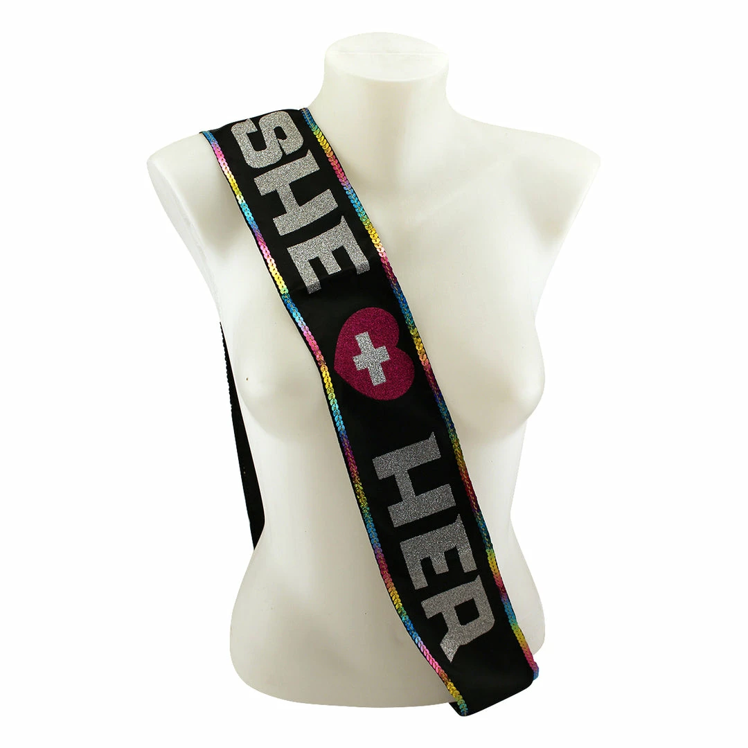 The She + Her Sash is perfect for the bride-to-be who’s getting ready to marry another bride-to-be! From its rainbow sequin lining to the glittery message and heart written out in big letters on the sash, this sash is a beautiful way to help the bachelorette say it loud and say it proud!