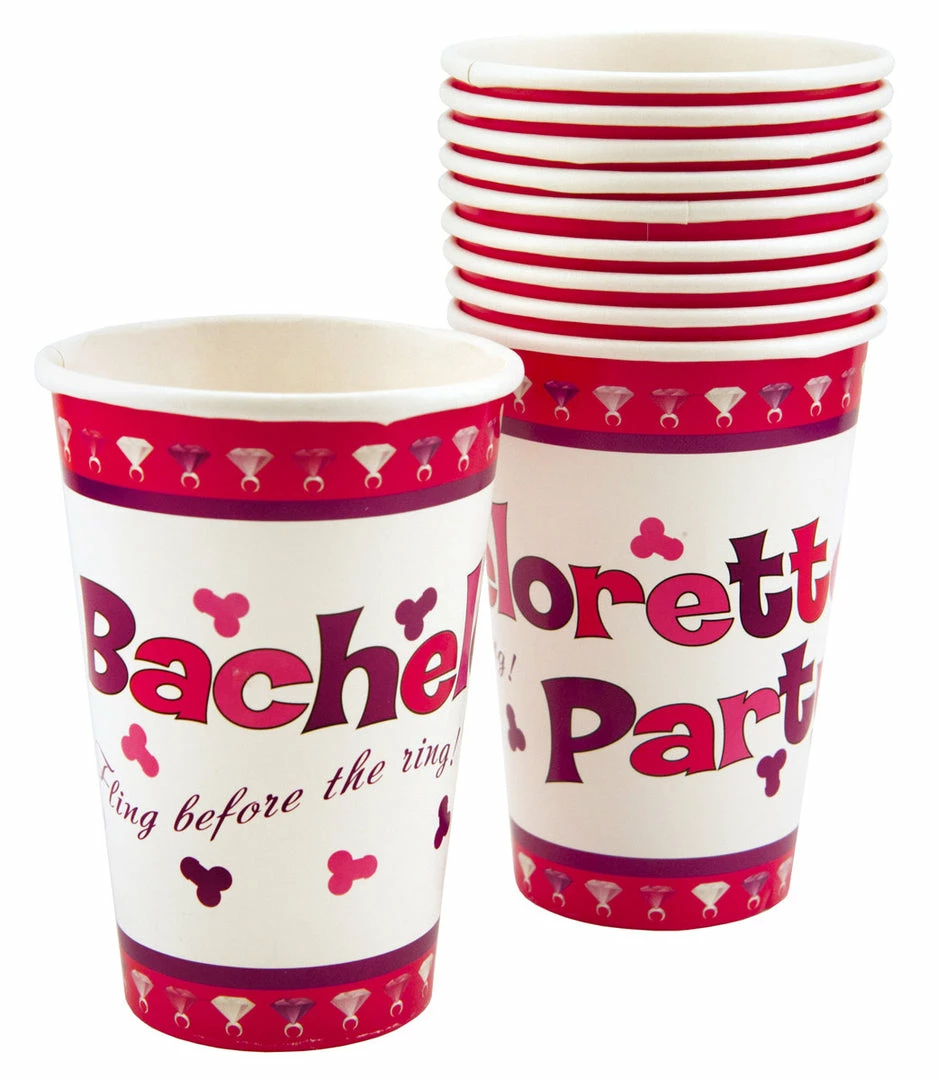 The Pink and Purple Penis Party Cups come ten to a package, and are just the right size for mixed drinks. They are white and covered with pink and purple penises. They say, “Bachelorette Party” in large letters across the cup, with “Final Fling Before the Ring … Final Night of Freedom!” in script.