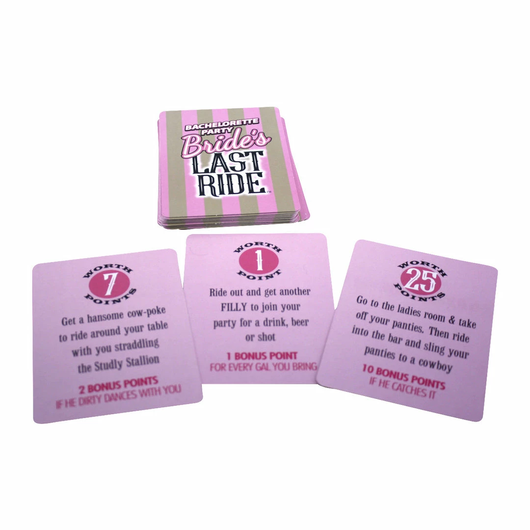 Bachelorette’s Last Ride is a scavenger hunt-type of bar game, where girls will take turns going around the bar trying to complete 25 different challenges and earning points for those they complete. But what sets it apart from other scavenger hunt games is that most of these challenges involve the Studly Stallion. What’s a Studly Stallion? Well, if you’re at all familiar with the kind of wacky hijinks bachelorette parties are known for, you probably guessed it: it’s a hobbyhorse that looks like a cartoonishly big dick.