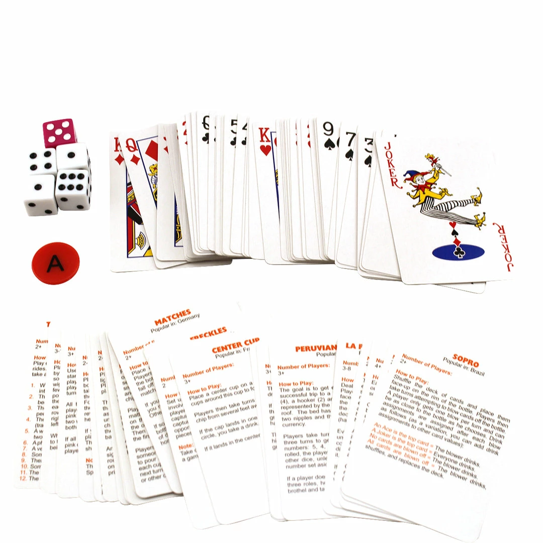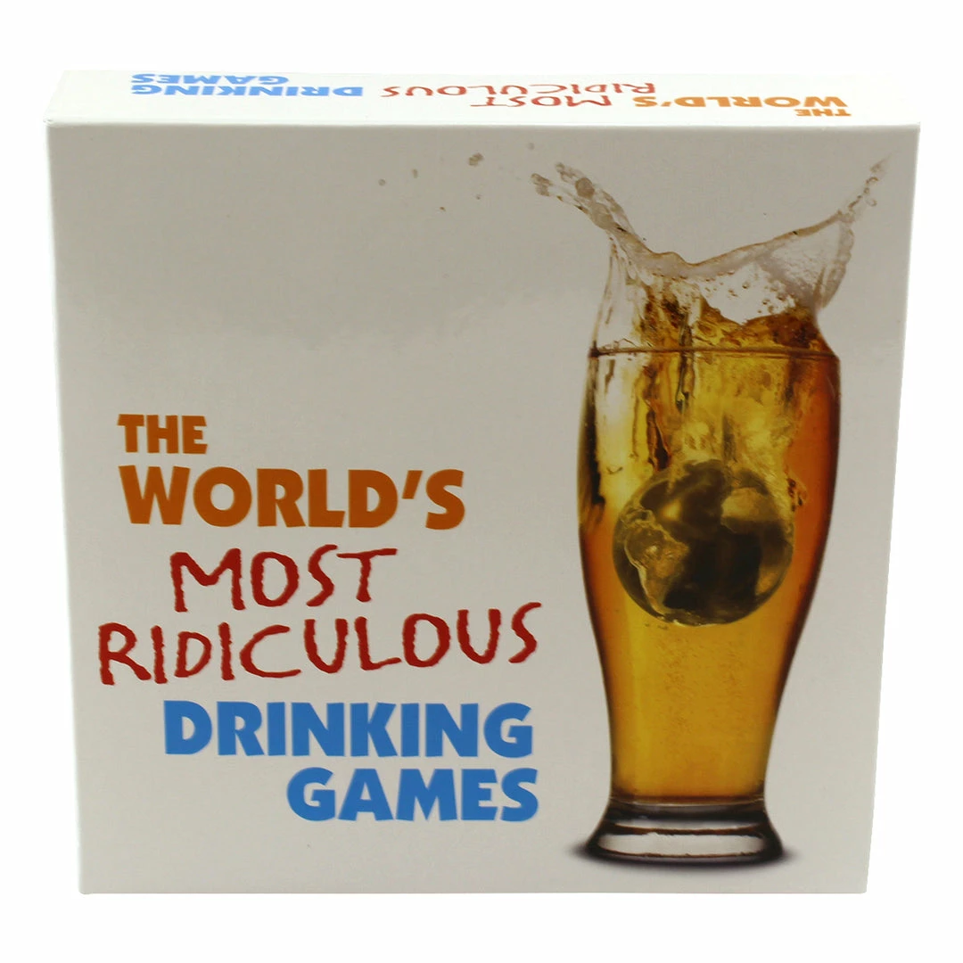 The World’s Most Ridiculous Drinking Games includes rules for 30 drinking games from around the world, a deck of playing cards, a game chip, and five dice.