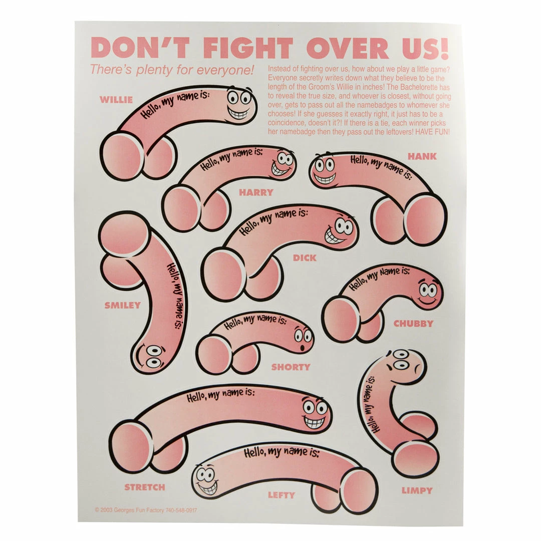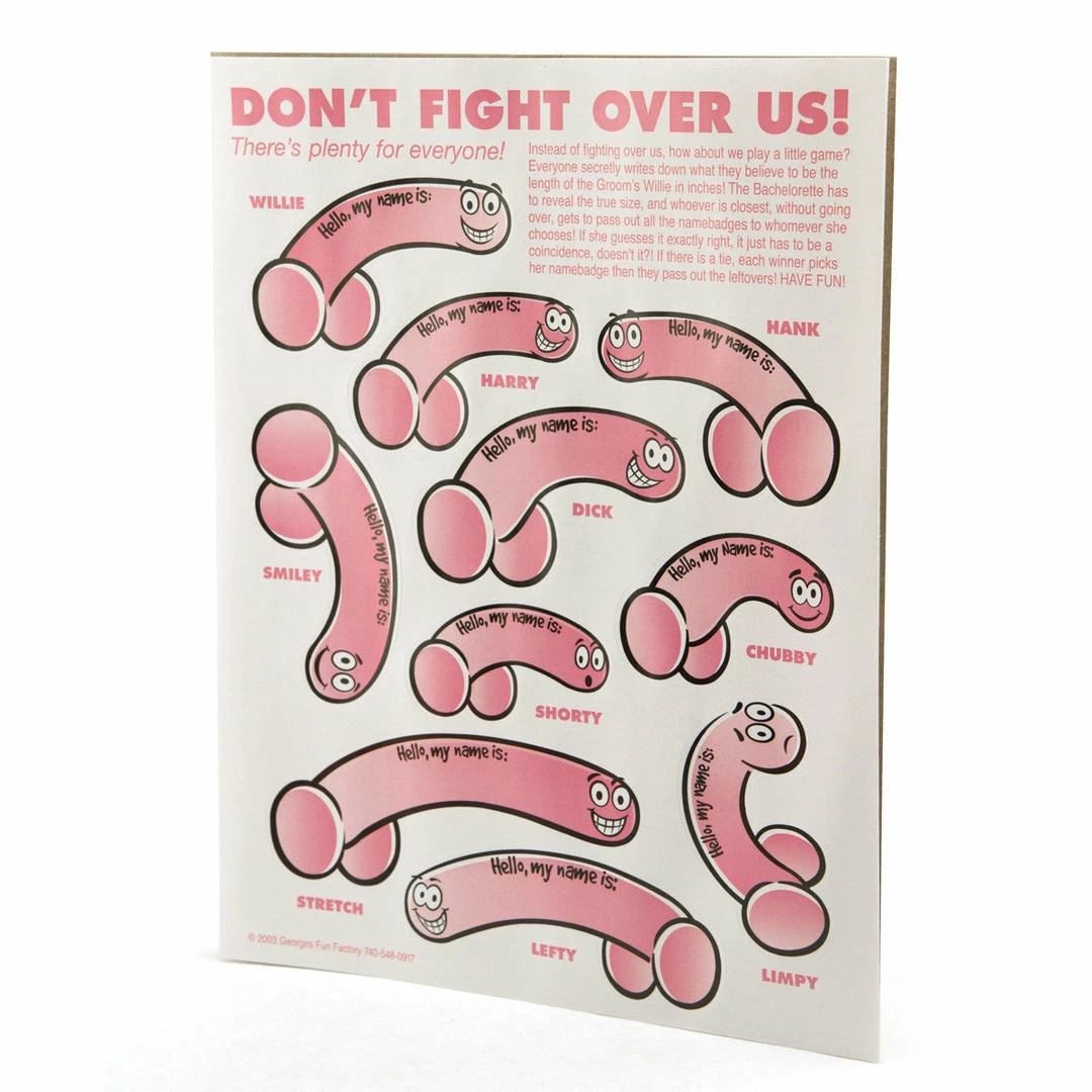 Instead of fighting over them, how about playing a little game? Everyone secretly writes down what they believe to be the length of the Groom’s Willie in inches! The Bachelorette has to reveal the true size, and whoever is closest, without going over, gets to pass out all of the namebadges to whomever she chooses! If she guesses the length exactly right, it just has to be a coincidence, doesn’t it?! If there is a tie, each winner picks her namebadge, and then they pass out the leftovers.