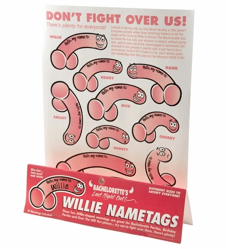 These fun, Willie-shaped nametags are great for bachelorette parties, Over the Hill Parties, and Birthday Parties (past a certain age, of course). Really, they’re good for any occasion where penis-shaped nametags would be appropriate. Which is a lot more occasions than you might think.